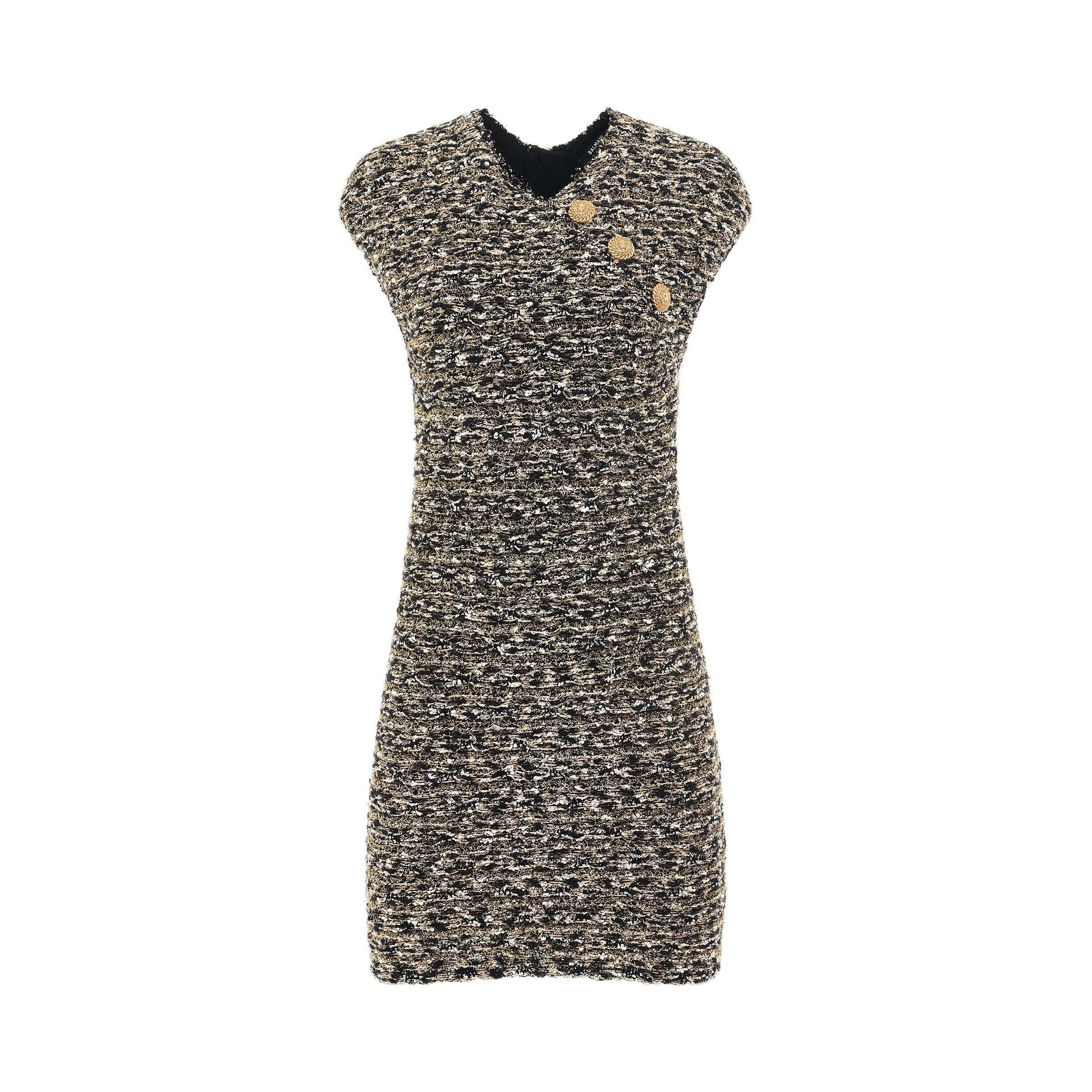 Look stylish and feel confident in this gorgeous black and gold tweed sleeveless dress. The beautifully-crafted tweed fabric ensures comfort while making a bold statement. Make a lasting impression at your next dinner date or a business meeting. - Composition: 52% Polyester, 48% Viscose - Tweed - Lurex detailing - Gold-tone buttons - V-neck - Rear zip fastening - Short sleeves - Straight hem - Thigh-length SKU: R6024KF16 EAD