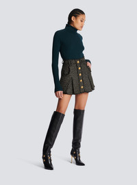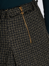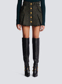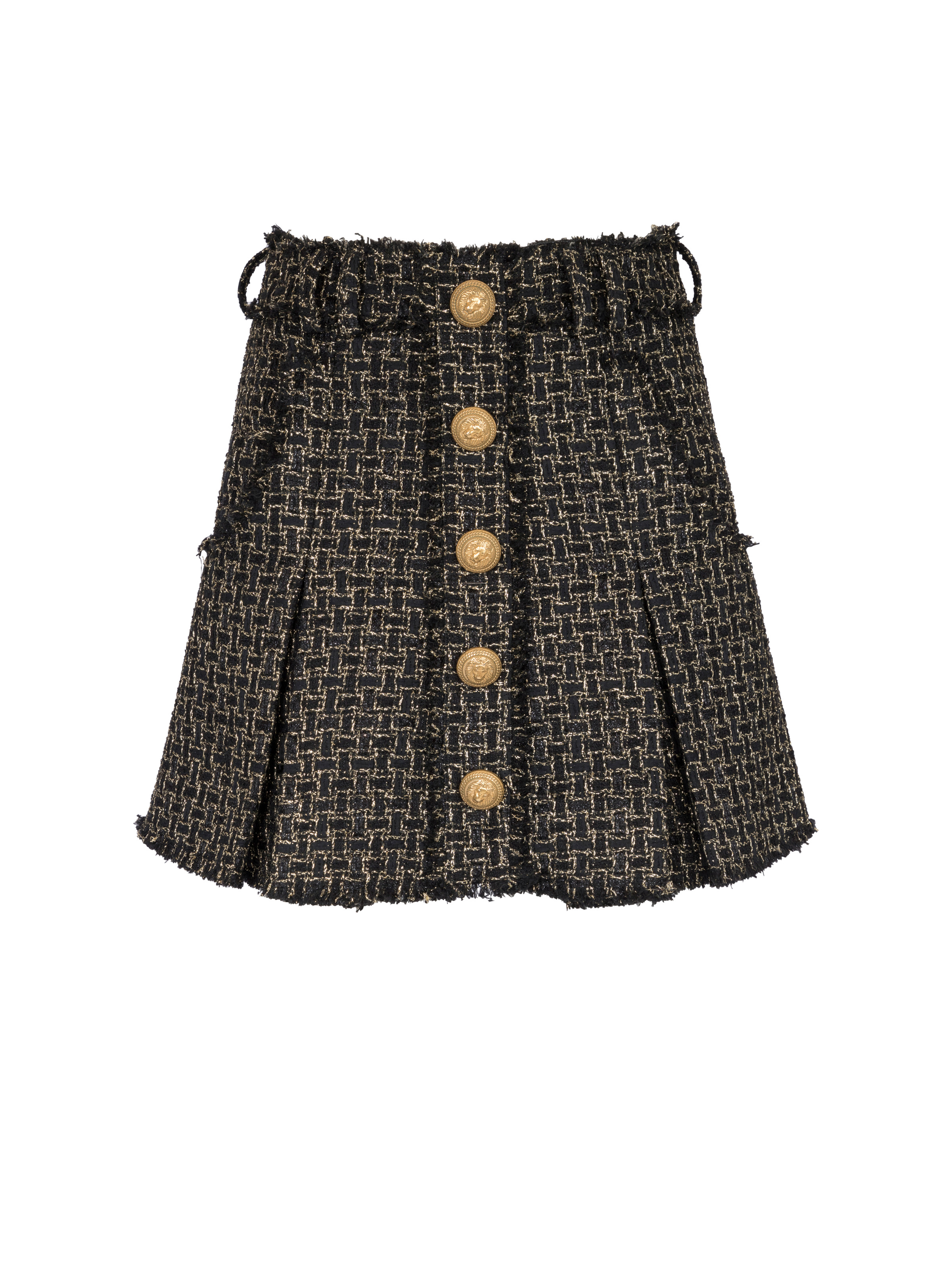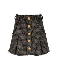 Pleated lurex tweed skater skirt - Short and flared cut - Wide box pleats, 4 pockets - Double and triple belt loops - 5 decorative golden metal 'Lion Head' buttons on the front - Golden metal zip fastening at the back - Frayed edging - Model measures 176cm and wears a size 36 - Material: 48% viscose, 34% polyester, 13% cotton, 5% polyamide - Made in Poland - Item: BF1LB870VD57