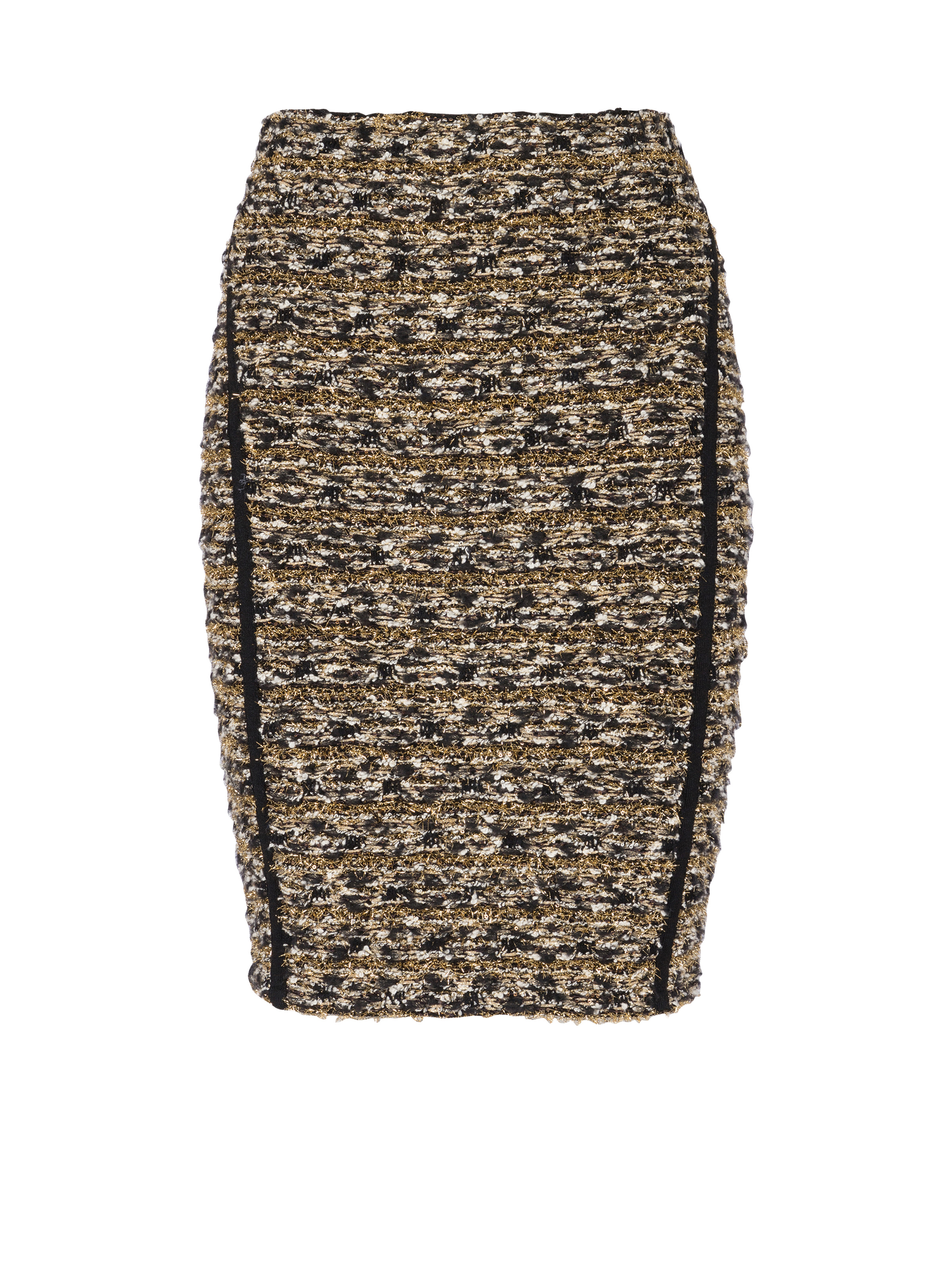 High-waisted skirt in lurex tweed - Fitted cut, knee-length - Contrasting edging - Double zip fastening at the back in gold metal - Model measures 178cm and wears a size 36 - Material: 48% viscose, 18% polyester, 15% polyamide, 10% cotton, 5% wool, 4% metallic polyester - Made in France - Item: BF0LC004KF16