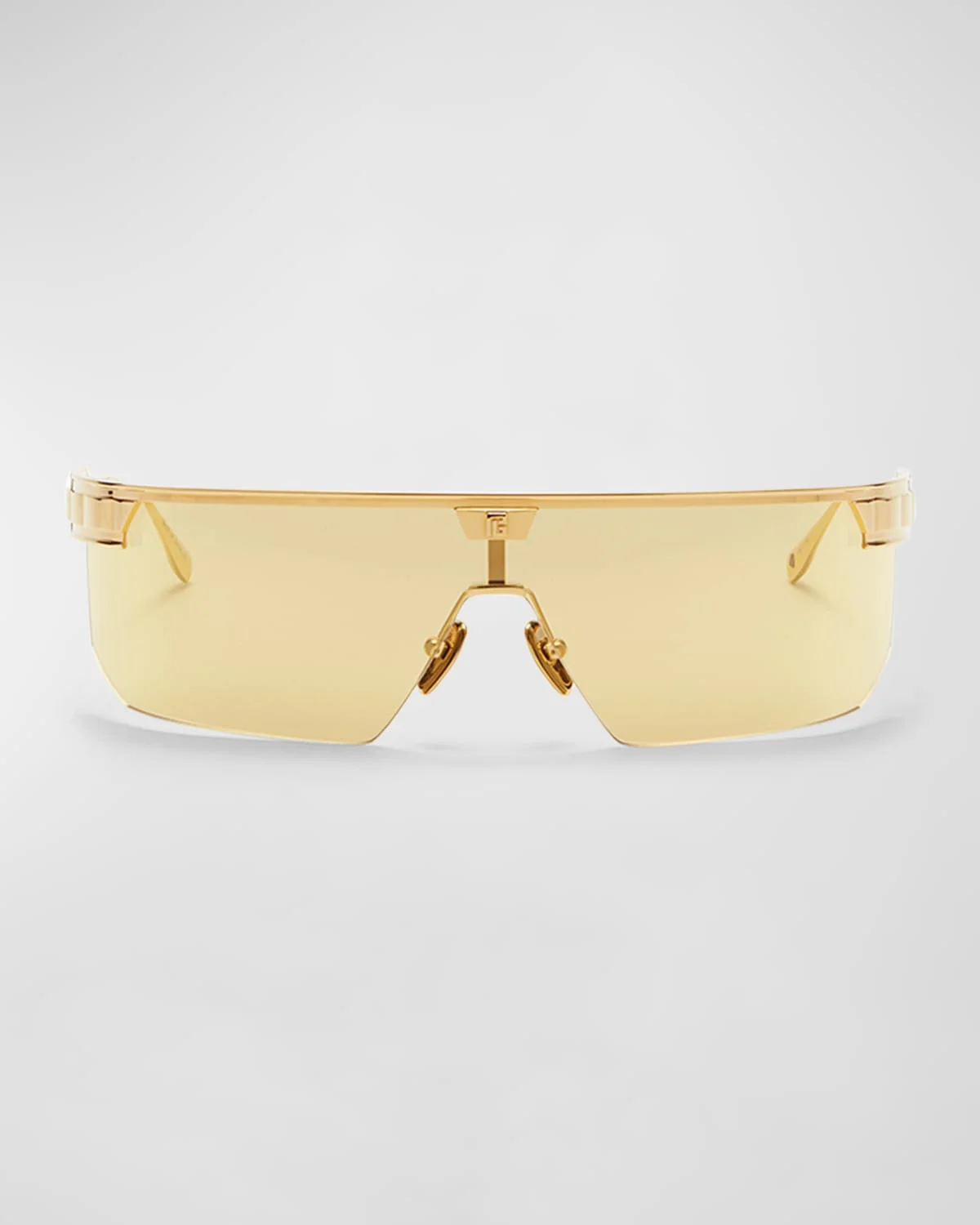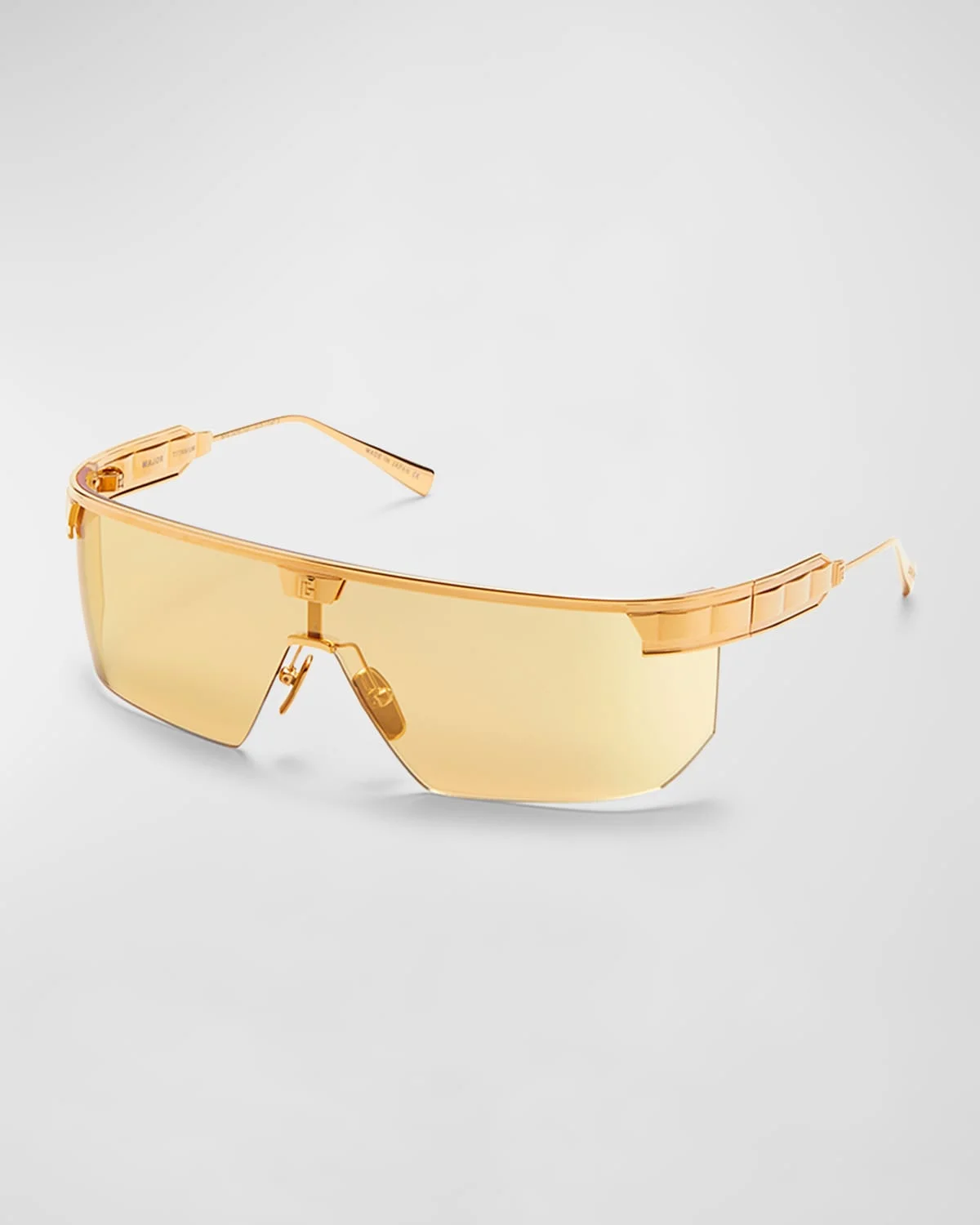 - Balmain "Major LTD" half-rimmed shield sunglasses in titanium - Features monogram accents - Mirror lenses - Adjustable nose pads - Thin, tapered arms - 100% UVA/UVB protection - Made in Japan - Proposition 65 warning for California residents