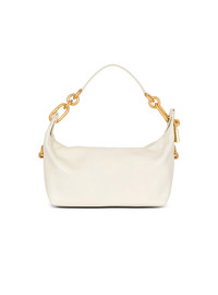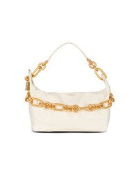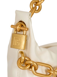 Medium Sync bag in calfskin leather - Soft leather bag - Chain and leather handles - Eyelets on the sides - PB-engraved gold metal padlock on the side - Embossed gold Balmain Paris logo on the front - Zip fastening with leather slider - Embossed leather inside card pocket - Canvas lining - Gold hardware - Dimensions: 28 x 14.5 x 9 cm - Main material: 100% calfskin - Made in Italy - Item: FN0BS002LMTE