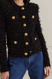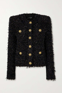 EDITORS'NOTES A house signature, Balmain's tweed jacket is tailored to skim your frame and has a beautifully tactile bouclé finish. Sharply padded shoulders, metallic threads and emblem-adorned buttons provide plenty of glamour. SIZE & FIT - Fits true to size, take your normal size - Designed for a slim fit - Internal shoulder pads - Mid-weight, non-stretchy fabric - Model is 180cm/ 5’11” and is wearing a FR 36 DETAILS & CARE - Black and gold bouclé-tweed - Button fastenings through front - 44% polyamide, 37% viscose, 19% polyester - Dry clean