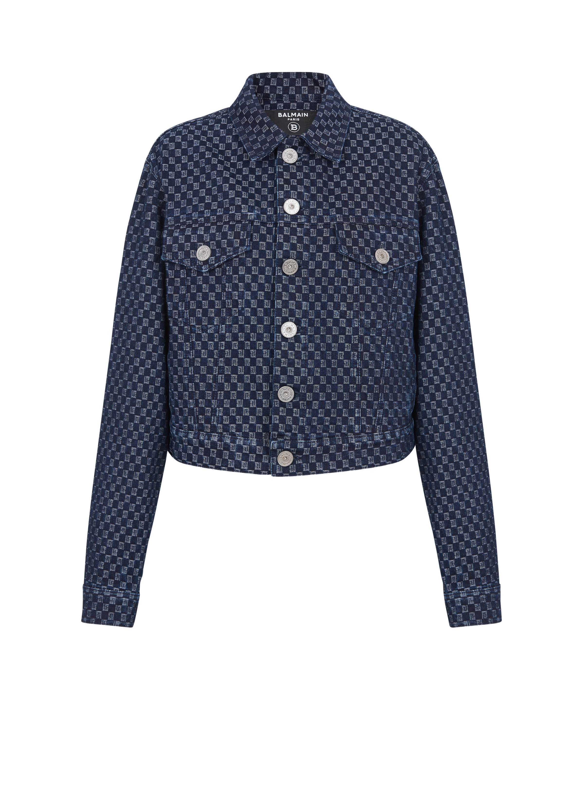 Mini monogram jacquard denim jacket - Straight cut - Front fastening - 6 flat Balmain-engraved buttons in silver metal - 2 flap pockets, 2 raglan pockets - Embroidered Pierre Balmain label on the back - Model measures 175cm and wears a size 36 - Material: 100% cotton - Made in Italy - Item: BF0TC110DD80