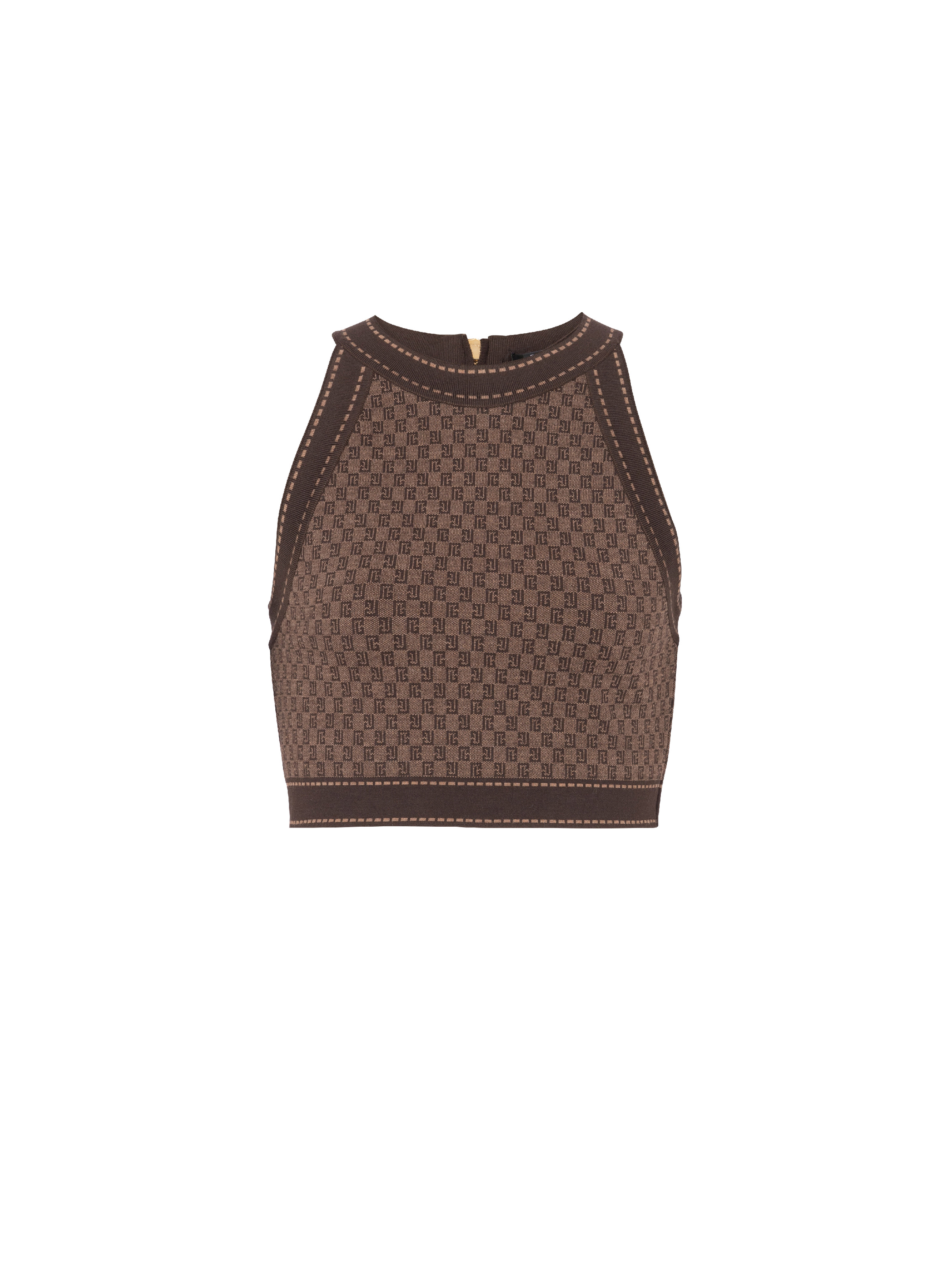 Mini monogram jacquard crop top - Tight fit - Round neck - Cutaway shoulders - Edges in a contrasting fine knit - Golden metal zip fastening at the back - Model measures 179cm and wears a size 36 - Material: 80% mohair, 20% polyamide - Made in France - Item: BF0AB008KF23