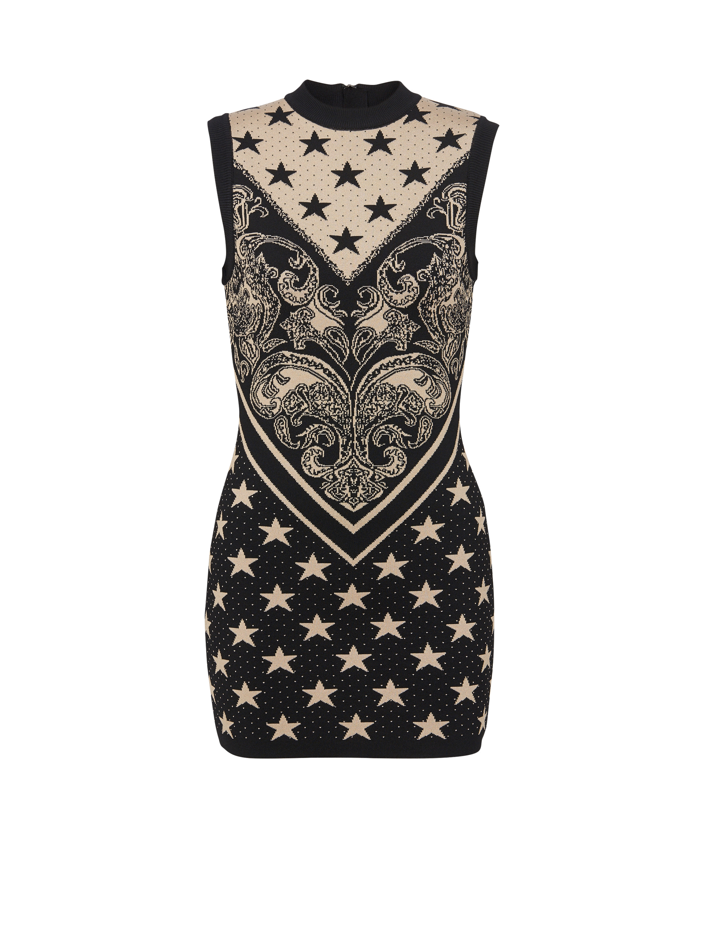 Fine knit contrasting stars and monogram dress - Short and tight fit - Round neck - Sleeveless - Fine contrasting block color ribbed finish - Black metal zip fastening at the back - Model measures 180cm and wears a size S - Model measures 182cm and wears a size 40 - Main material: 88% viscose 12% polyester - Made in France - Item: CF1R4205KF76100% of this item’s viscose fibres are RCS-certified and recycled