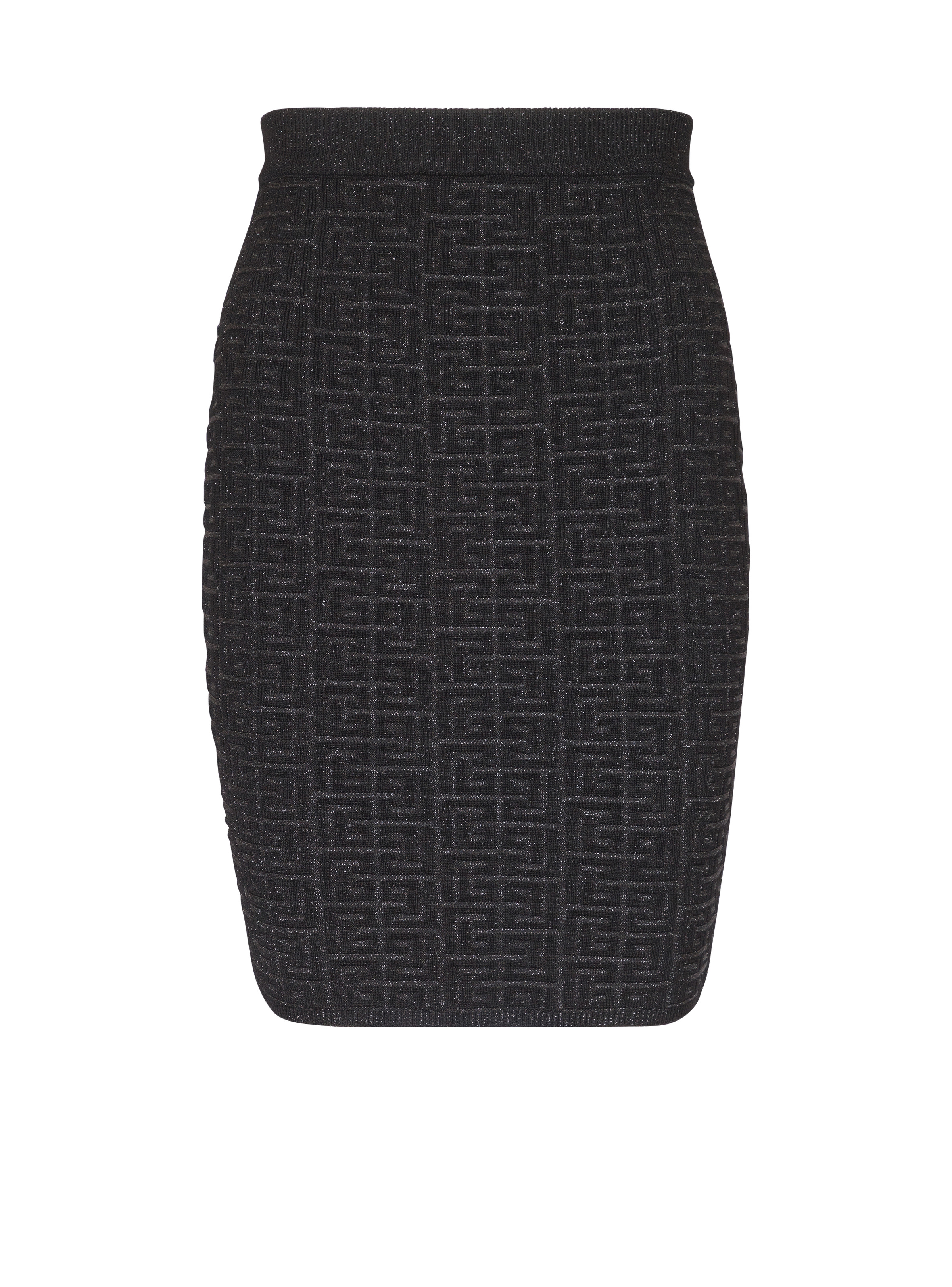 PB Labyrinth knit skirt - Fitted and high-waisted - Knee-length cut - Visible silver metal zip fastening on the back with Balmain Paris-engraved slider - Knit with shiny threads - Ribbed edging - Model measures 178cm and wears a size 36 - Main material: 86% viscose 10% polyester 4% metallic fibre - Made in France - Item: DF1LC056KG96100% of the viscose fibres used to make this garment come from certified, sustainably managed forests