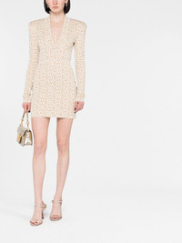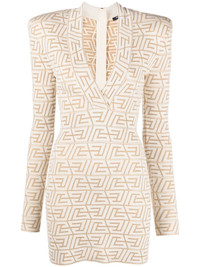 monogram-jacquard mini dress Cut to elegantly define the shape of the female figure, this Balmain bodycon dress flaunts a glistening metallic monogram motif, structured shoulders and a plunging V-neckline. Made in Italy Composition Viscose 51%, Polyamide 28%, Metallic Fibre 12%, Nylon 9% SIZE & FIT Model measurements Height 5 ft 12 in(1.82 m) Bust/Chest 34.25 in(87 cm) Hips 37.79 in(96 cm) Waist 25.19 in(64 cm) FittingInformation This piece fits true to size. We recommend you get your regular size Cut for a close fit Made with a mid-weight fabric Washing instructions Dry Clean Only