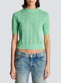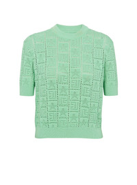 Openwork monogram knit jumperStars and monogram pattern woven into the knit - Short and tight fit - Round neck - Short sleeves - Model measures 180cm and wears a size 36 - Main material: 84% viscose 16% polyester - Made in Italy - Item: CF1AI091KF97100% of the viscose fibres used to make this garment come from responsibly managed and FSC®-certified forests