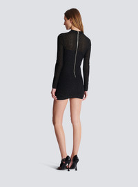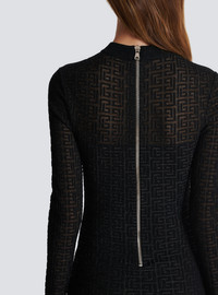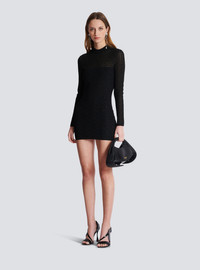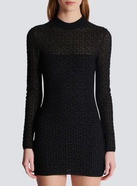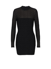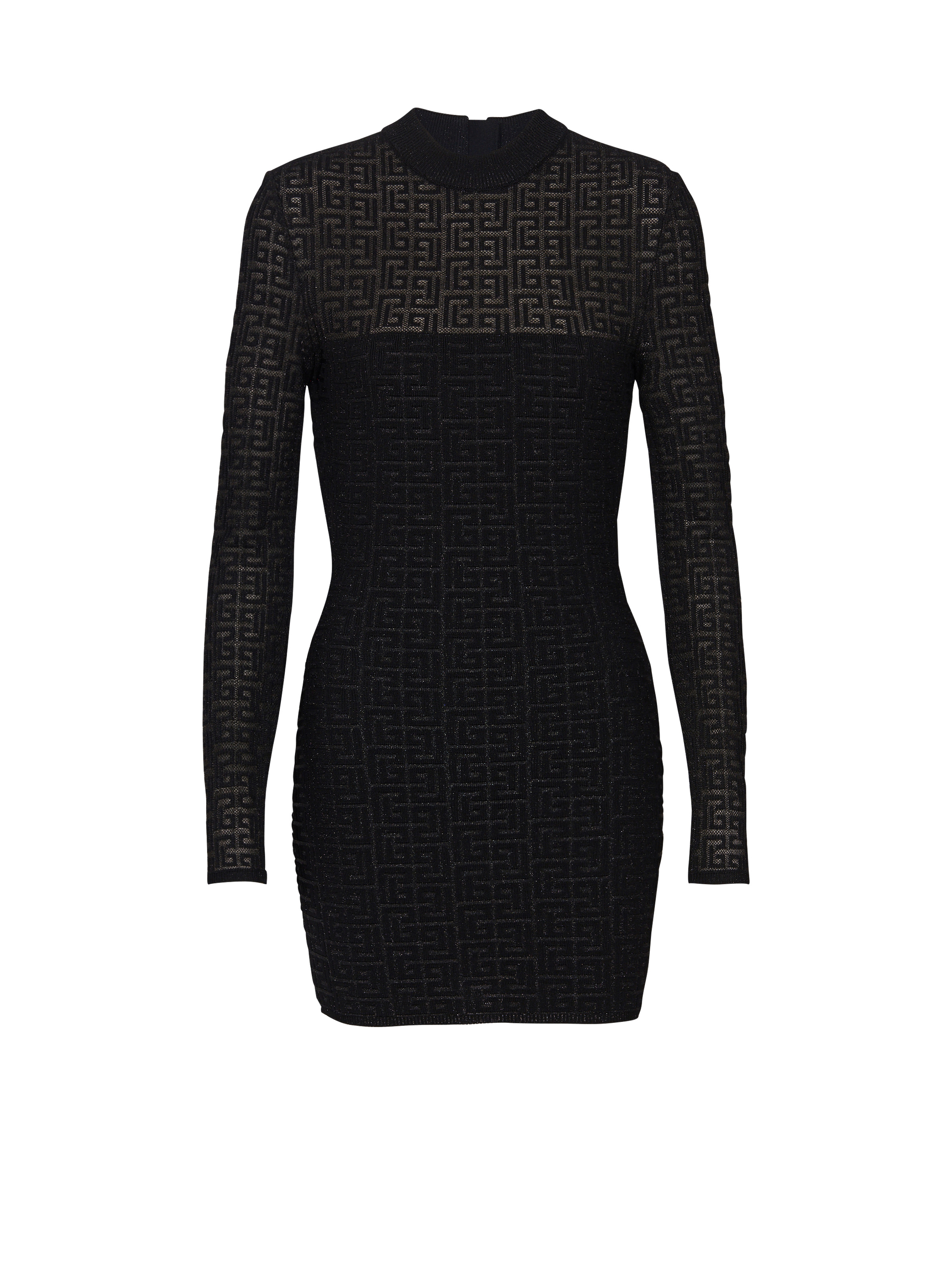 PB Labyrinth knit dress - Short fitted cut - Crew neck - Long sleeves - Visible silver metal zip fastening on the back with Balmain-engraved slider - Shiny knit with sheer details - Ribbed edging - Model measures 180cm and wears a size 36 - Main material: 81% viscose 9% polyester 6% polyamide 4% metallic fibre - Made in France - Item: DF1R8029KG96100% of the viscose fibres used to make this garment come from certified, sustainably managed forests