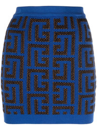 monogram-pattern miniskirt Balmain's 'PB' monogram was first used in the '70s and is created from the interlocking initials of Pierre Balmain. The pattern is used in a contemporary way on this fitted mini skirt as an eye-catching, all-over pattern. Made in France Composition Viscose 79%, Polyester 14%, Polyamide 7% SIZE & FIT Model measurements Height 5 ft 10 in(1.78 m) Bust/Chest 31.49 in(80 cm) Hips 35.03 in(89 cm) Waist 23.62 in(60 cm) FittingInformation This piece fits true to size. We recommend you get your regular size Cut for a slim fit Made with a mid-weight fabric Washing instructions Hand Wash