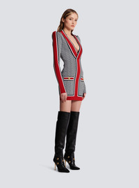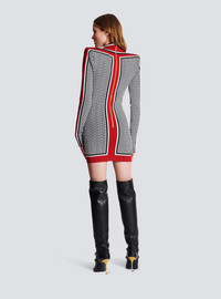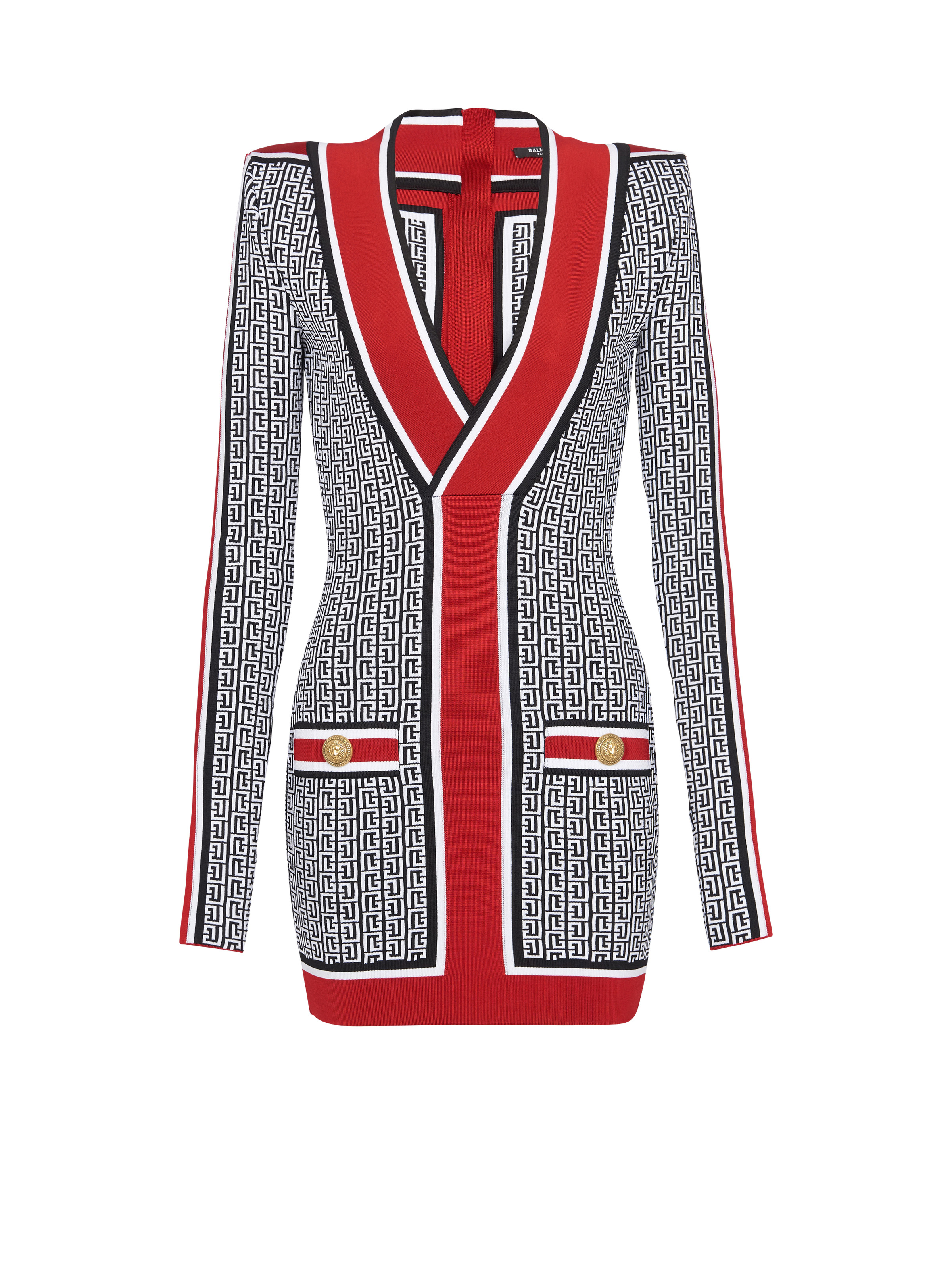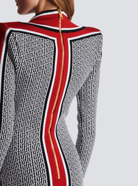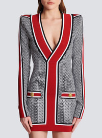 Monogrammed fine knit dress - Tight fit - Plunging V-neck - Long sleeves - 2 trompe l'oeil-effect pockets and golden metal 'Lion Head' buttons - Bands with contrasting stripes - Golden metal zip fastening at the back - Model measures 175cm and wears a size 36 - Material: 88% viscose from sustainably managed forests, 10% polyester, 2% polyamide - Made in France - Item: BF1R8562KE89