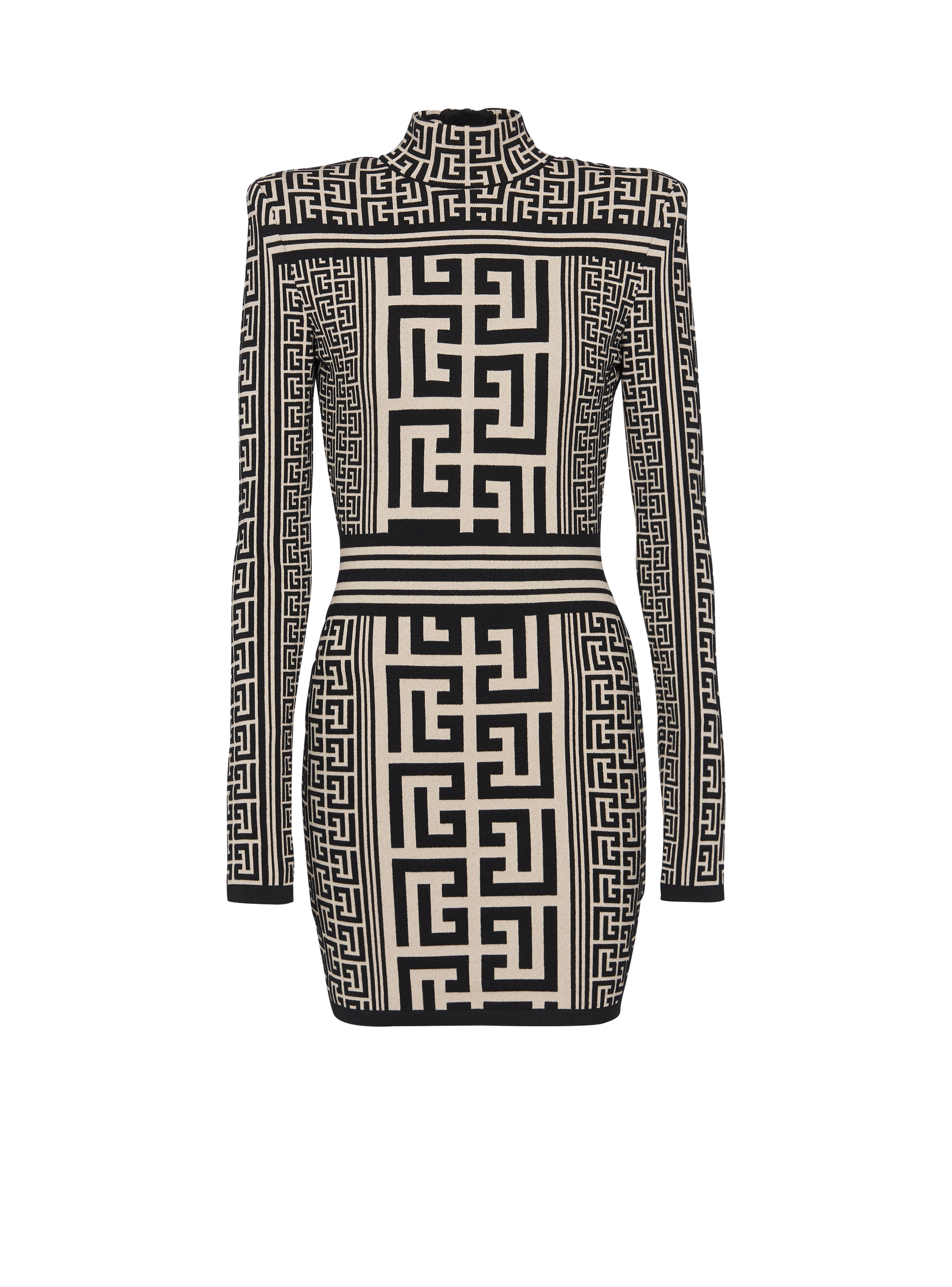Monogrammed knit dress - Tight fit - Funnel neck - Structured shoulders, long sleeves - Marked waist - Black metal zip fastening at the back - Model measures 175cm and wears a size 36 - Material: 51% wool, 28% viscose, 19% polyamide, 2% elastane - Made in Italy - Item: BF1R8018KE98