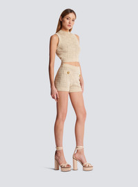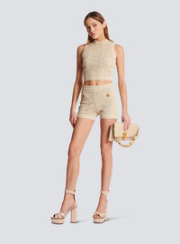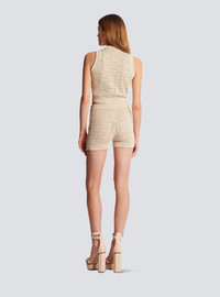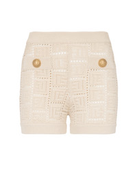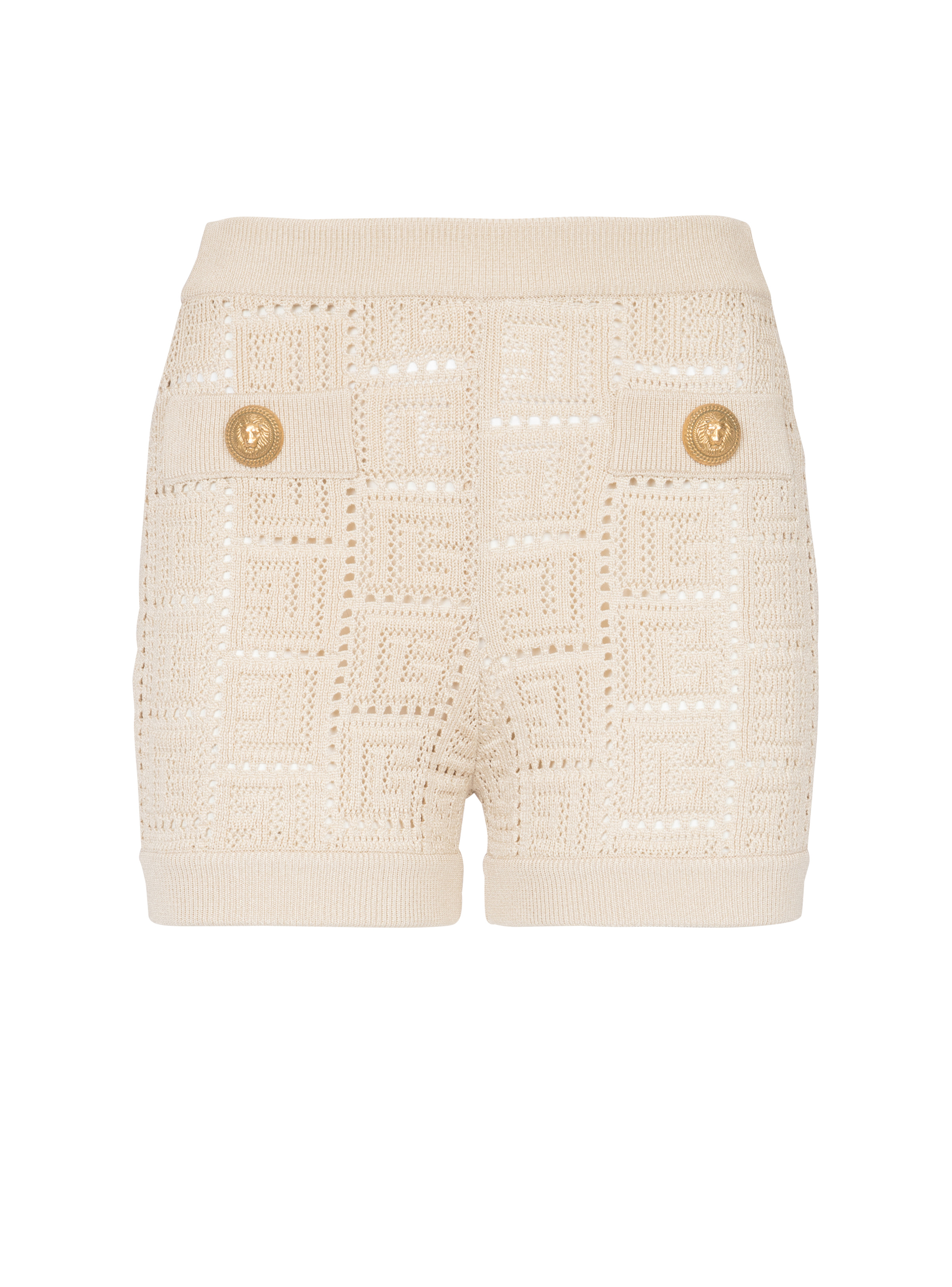 Monogrammed openwork knit mini shorts - Knitted monogram pattern - Tight fit - Trompe-l'oeil buttoned side pockets, signature gold "lion's head" engraved buttons - Ribbed trim - Model measures 175cm and wears a size 36 - Materials: 83% viscose, 17% polyester - Made in Italy - Item: AF0PA197KE25 100% of the viscose fibres in this garment come from sustainably managed FSC®-certified forests