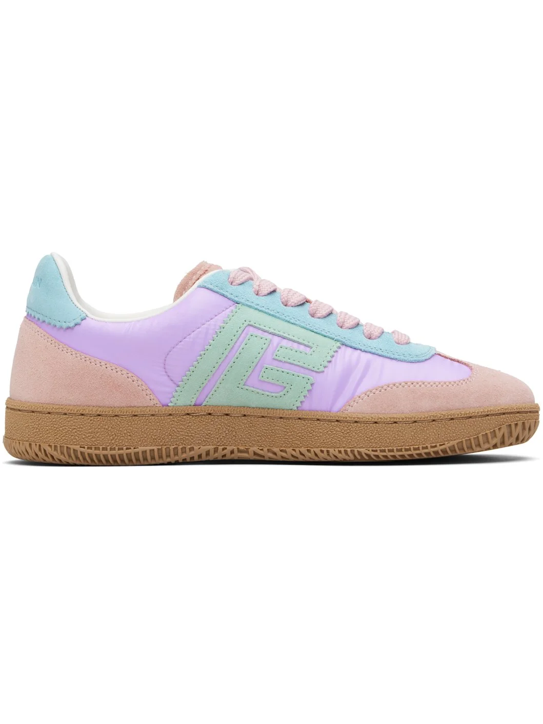 Low-top calfskin suede and taffeta sneakers. · Serrated edges throughout · Lace-up closure · Logo embossed at padded tongue · Padded collar · Logo patch at sides · Logo embossed at outer side and heel tab · Buffed leather lining · Treaded rubber sole Supplier color: Multicolor Upper: calfskin, textile. Sole: rubber. Made in Italy 252251F128000