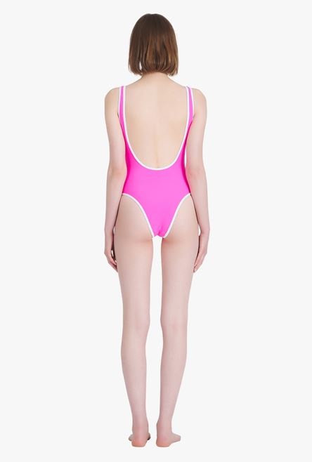 Neon pink and white polyamide racerback one-piece Crew neckline, scoop back, sleeveless, "B" Balmain logo print ITEM INFORMATION - Fitted cut - The model is wearing FR size 36 - The model's height is 177 cm / 5 ft 9 in, bust 81 cm / 32 in, waist 58 cm / 23 in, hips 89 cm / 35 in - Made in Italy - Materials: 78% Polyamide, 22% Elastane - Item: BKBU90650010
