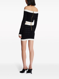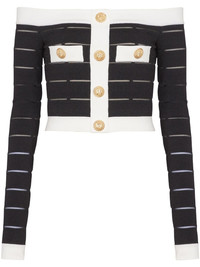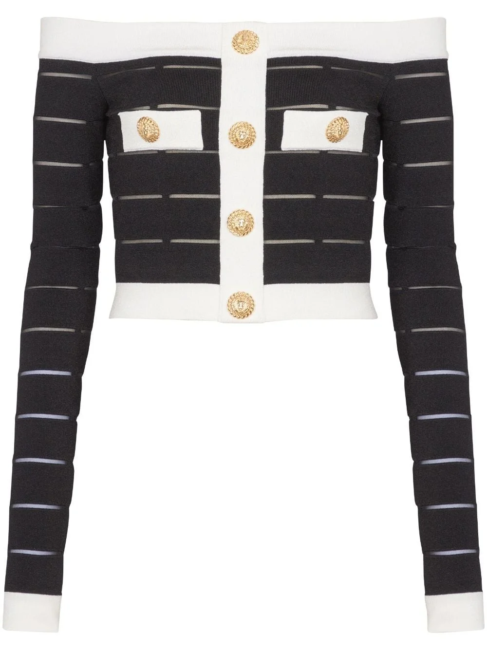 off-shoulder knitted top Eye-catching embossed buttons are a mainstay at Balmain, speaking to the house's opulent aesthetic. They appear in a gold-tone finish here, contrasting with the top’s black and white colourway for an elevated casual look. Highlights - Black/white - Knitted construction - Openwork areas - Contrasting trim - Decorative button detailing - Off-shoulder - Rear zip fastening - Long sleeves - Cropped - Straight hem Made in Italy Composition Viscose 87%, Polyester 12%, Polyamide 1% Washing instructions Read Manufacturer Guidelines