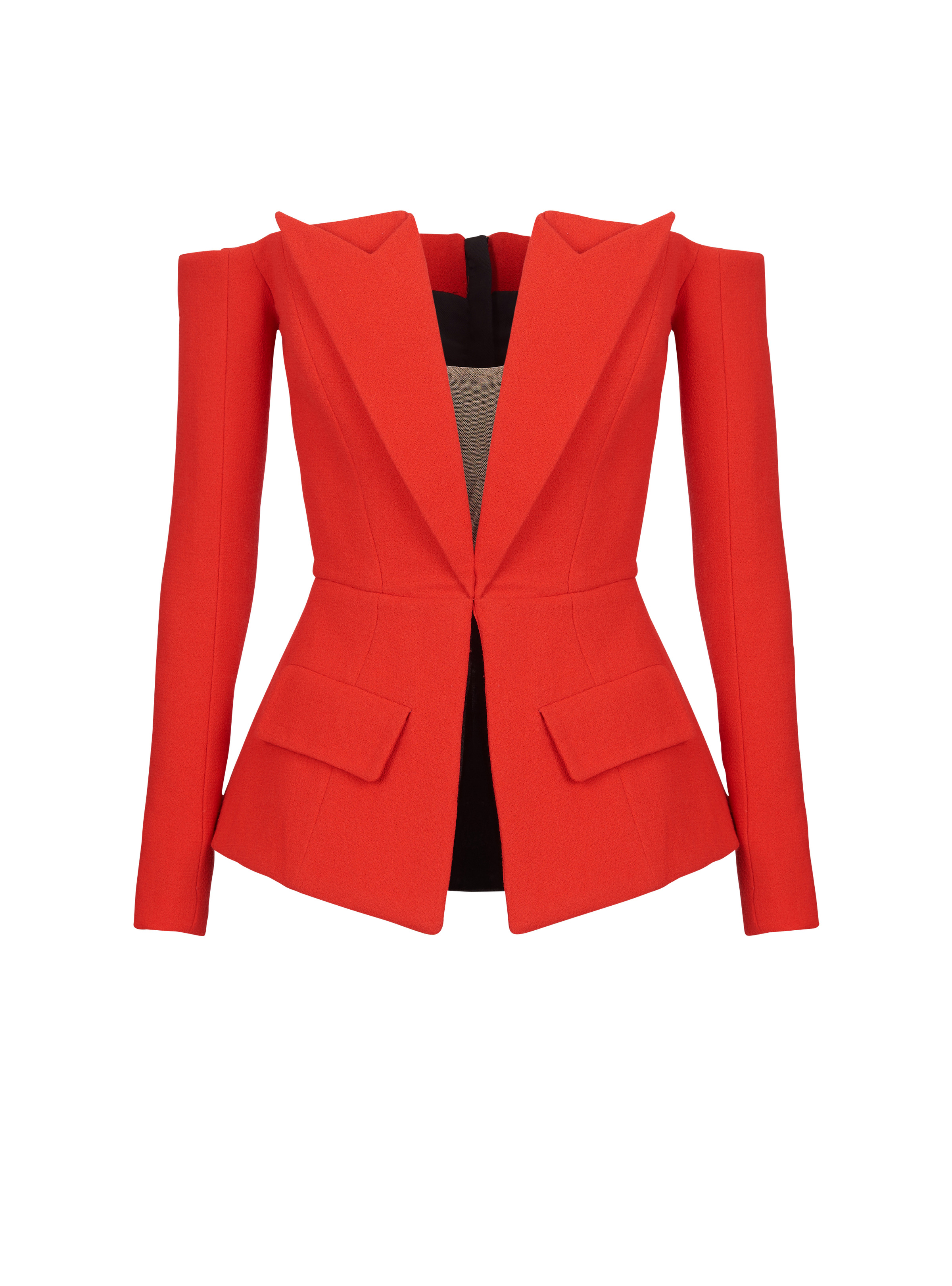 Crepe peplum top - Plunging V-neck - Pointed tailored half-collar - Off the shoulders - Long sleeves, wrist length, gloves not included - Marked waist - Velvet detail on front - 2 welt pockets with flaps - Black metal zip fastening at the back - Model measures 175cm and wears a size 36 - Material: 100% virgin wool - Made in France - Item: BF0AP170WB86