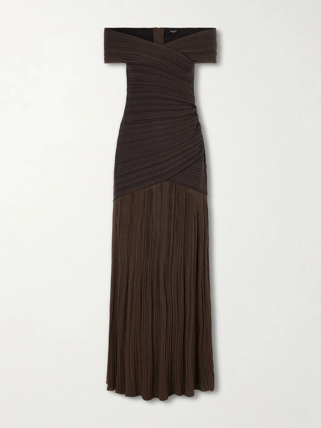 Balmain blends bold structure with fluid, feminine movement in this maxi dress. Made from lustrous knit, it has a fitted off-the-shoulder bodice that flows into a softly draped skirt, creating elegant motion and a dynamic silhouette. Pair with strappy heels and minimal accessories to let the pleats and luxurious knit shine.