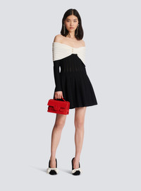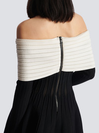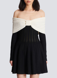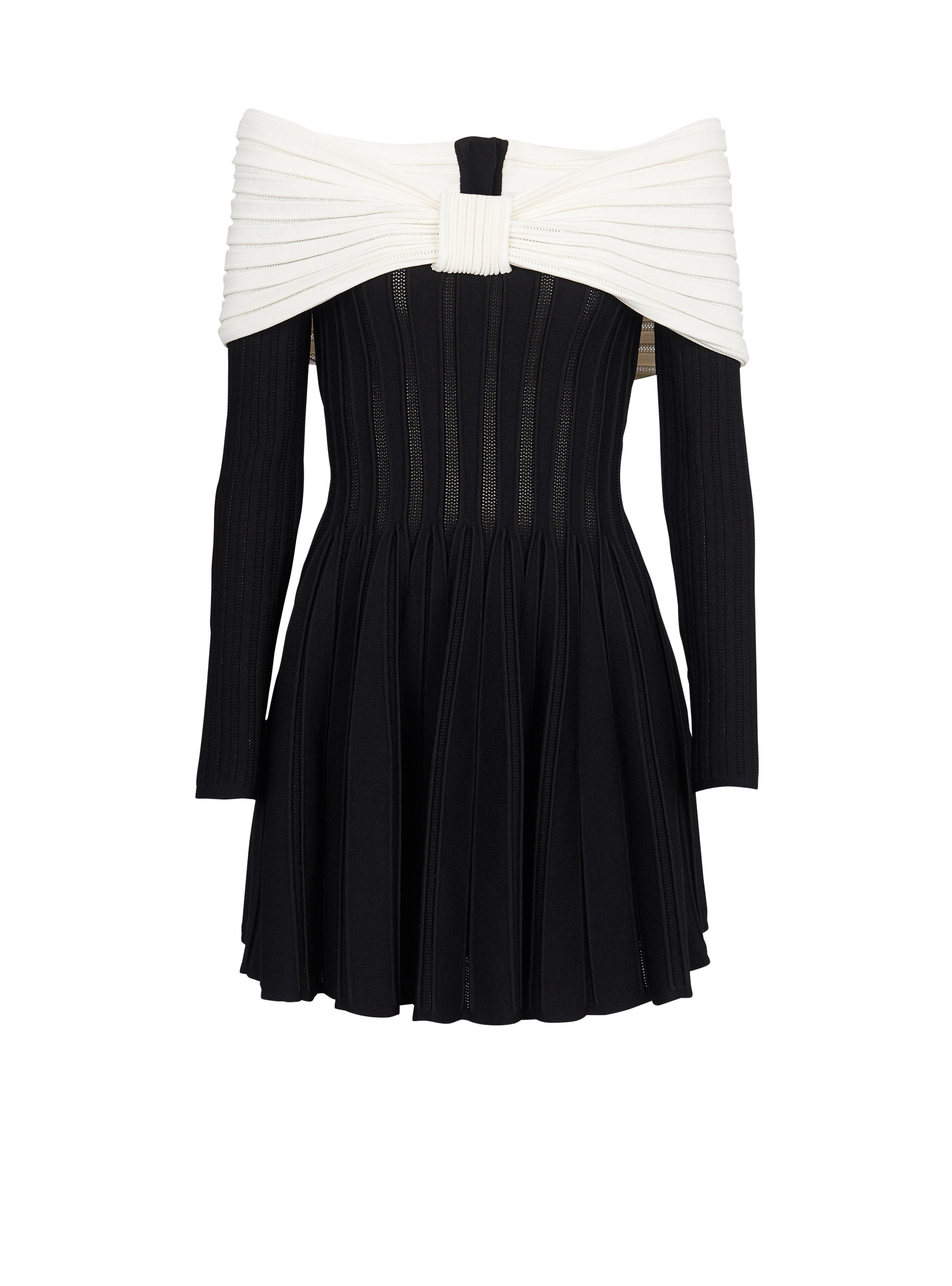 Textured knit skater dress - Flared and pleated cut - Off-the-shoulder bow neckline - Marked waist - Long sleeves - Black metal zip fastening at the back - Model measures 178cm and wears a size 36 - Material: 88% viscose, 12% polyester - Made in Italy - Item: BF0R9499KF13 100% of the viscose fibres used to make this garment are recycled and RCS-certified