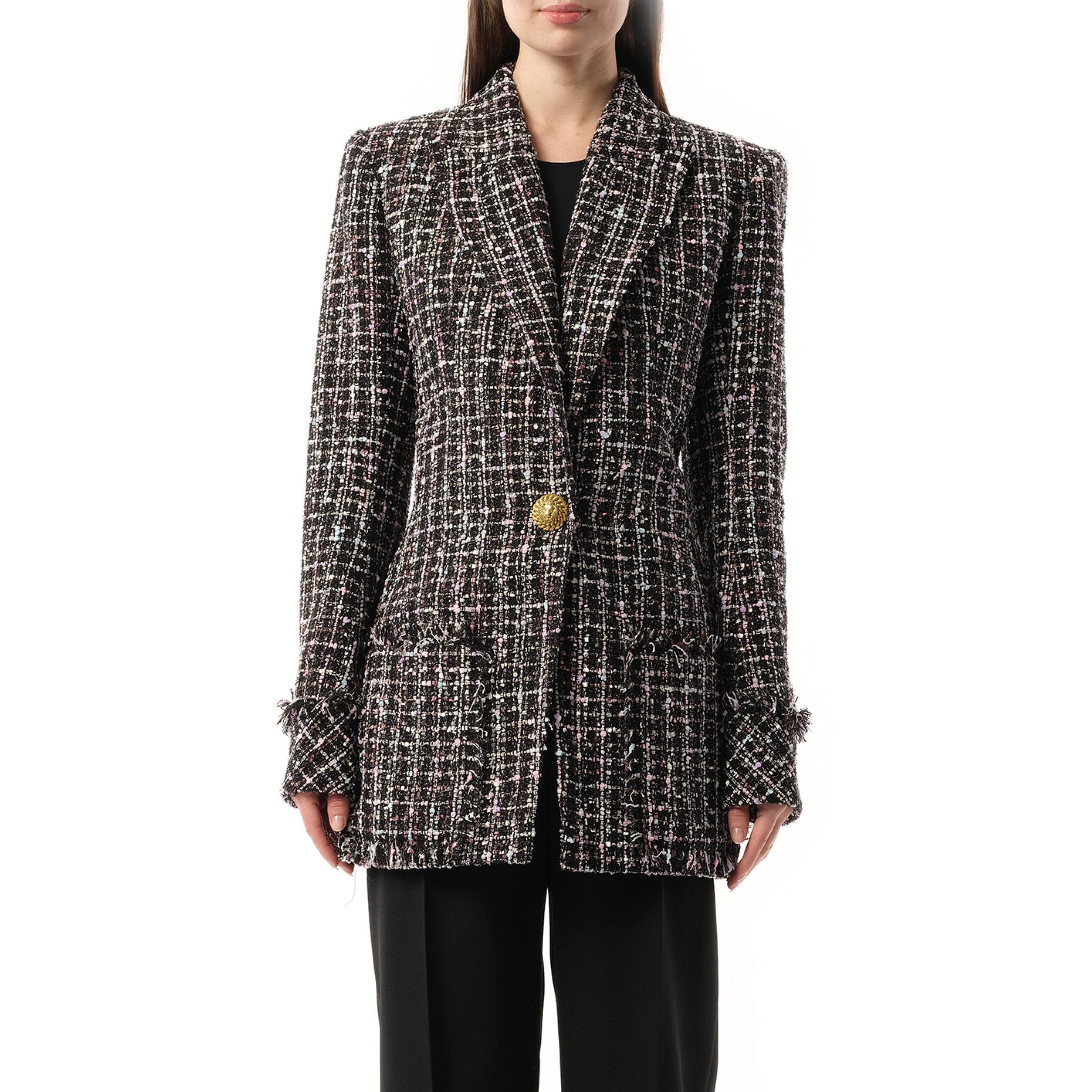 This 1 button tweed fitted jacket in black/multicolour is the perfect blend of classic style and modern design. Made from high-quality tweed, it offers both comfort and durability. The fitted silhouette is flattering and versatile, making it a must-have piece for any wardrobe. - Composition: 100% Polyester - Frayed detailing - Embossed gold-tone buttons - Peak lapels - Front button fastening - Shoulder pads - Long sleeves - Two front patch pockets - Made in France Model is 175 cm and wears size 38 SKU: SE096XJ24 EAH