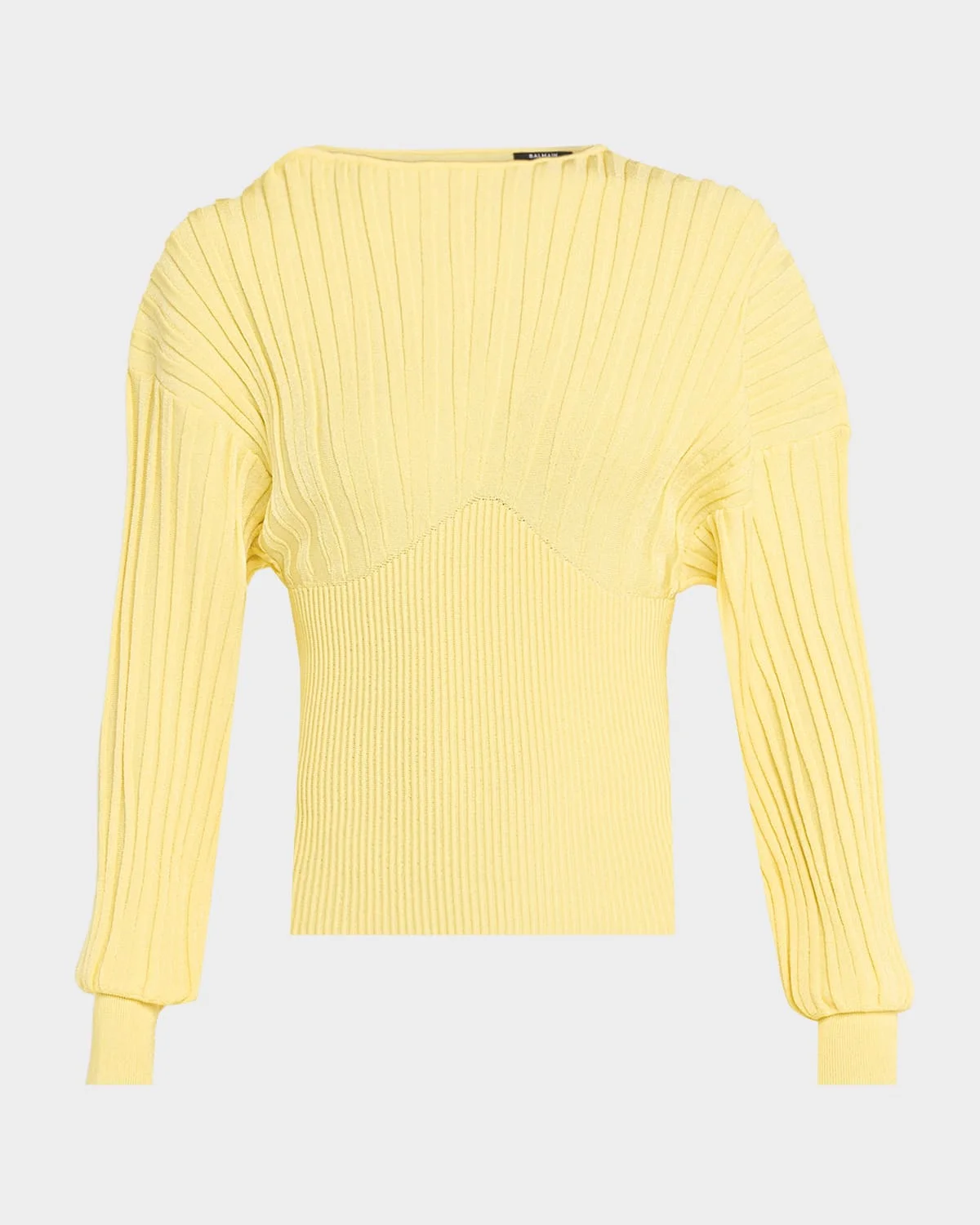 Balmain sweater is crafted from wide ribbed knit blouson bust with batwing sleeves and & nbsp; is & nbsp;fitted & nbsp;through the waist with a thinner ribbed knit One-shoulder neckline Long batwing sleeves Ribbed cuffs Drop shoulders Fitted Pullover style Viscose/polyester Professional cleaning recommended Made in Italy