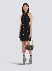 Short dress Sleeveless, open back, zip fastening in back, embossed gold-tone buttons, four flat pockets in front Fitted cut Fits true to size, select your usual size The model is wearing FR size 36 The model's height is 177 cm / 5 ft 9 in, bust 81 cm / 32 in, waist 58 cm / 23 in, hips 89 cm / 35 in Made in Slovakia Materials: 86% Viscose, 10% Polyamide, 4% Elastane Item: WF1R5081J017