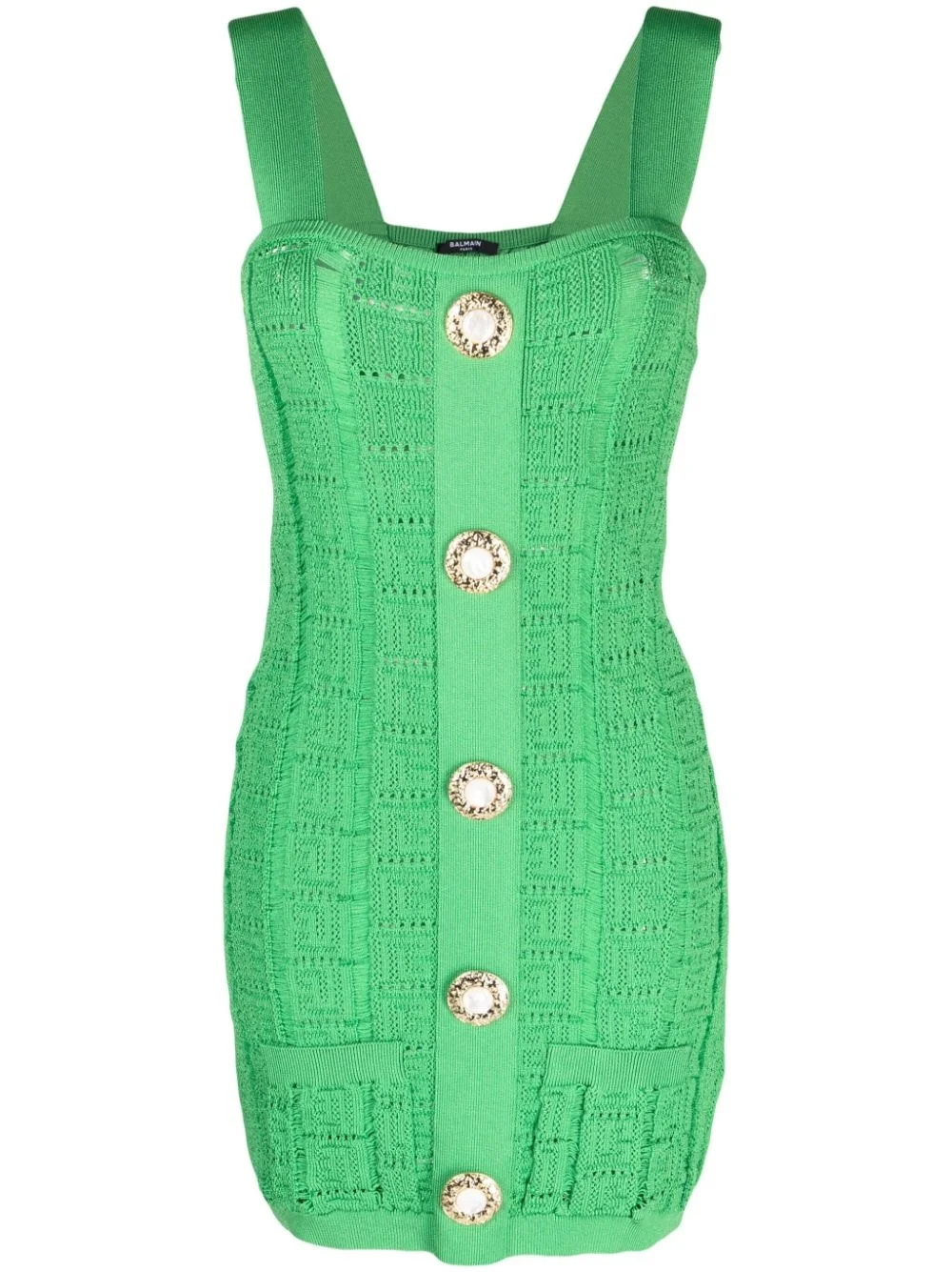 open-knit minidress Highlights - Green - Open knit - Square neck - Sleeveless - Front button fastening - Thigh-length Made in Italy Composition Viscose 84%, Polyester 16% SIZE & FIT Model measurements Height 5 ft 10 in(1.79 m) Bust/Chest 31.49 in(80 cm) Hips 34.64 in(88 cm) Waist 22.83 in(58 cm) FittingInformation Designed for a close fit throughout Made with a midweight knit, this piece offers some stretch This piece fits close in all sizes – take your usual size Washing instructions Dry Clean Only