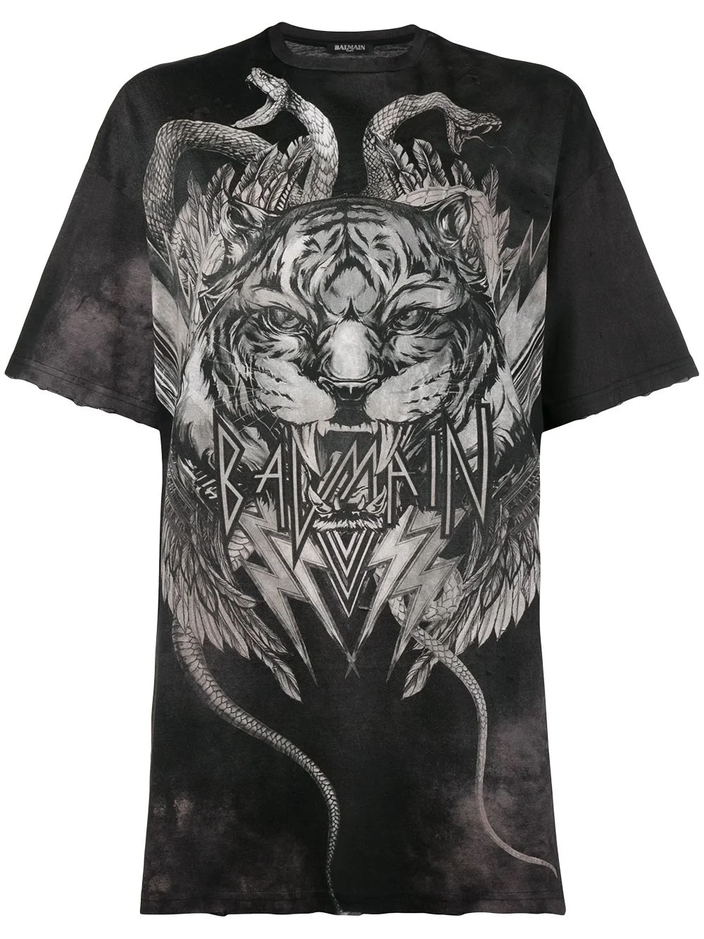 oversized tiger print t-shirt Olivier Rousteing implements a ‘more is more’ philosophy which showed no boundaries in Balmain’s AW17 collection. Expect a visually rich line-up of opulent fabrics, daring cuts and his signature decadent embellishing. Crafted from crisp cotton, this oversized tiger print t-shirt from Balmain features a round neck, a print to the front, short sleeves and a straight hem. Made in France Composition Outer: Cotton 100% SIZE & FIT Model measurements Height 5 ft 10 in(1.78 m) Bust/Chest 33.85 in(86 cm) Hips 34.25 in(87 cm) Waist 24.01 in(61 cm) Washing instructions Hand Wash