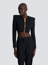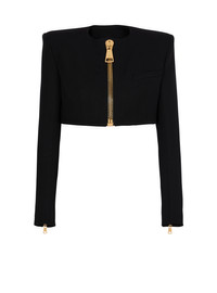 Cropped collarless jacket in grain de poudre wool - Built-in shoulder pads - Long sleeves ending in a large zip with a Balmain Paris-engraved slider - Welt chest pocket - Large zip with oversized PB-engraved slider - Tailored fit - Lined - Model measures 180cm and wears a size 36 - Main material: 100% sheep's wool - Made in Bulgaria - Item: FF0SD228WC09100% of the wool fibres used to make this garment are sourced from sheep farms that are certified and animal welfare-friendly