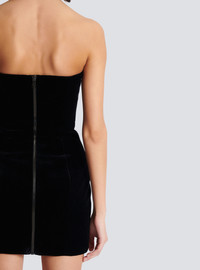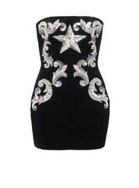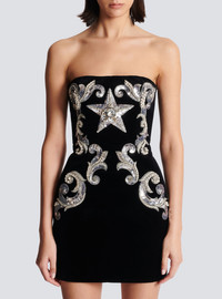 Short strapless star and paisley embroidered velvet dress - Short and tight fit - Off-the-shoulder neckline - Textured embroidery, crystals, beads, round and micro sequins - Fastening with black metal zip at the back - Model measures 180cm and wears a size 36 - Main material: 100% cotton - Made in India - Item: CF1R1008PC21