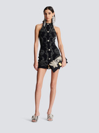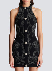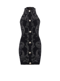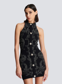 Sleeveless lurex jacquard dress - Contrasting lurex paisley pattern - 6 decorative “Signature Lion” silver metal buttons on the front - Short and tight fit - Cutaway shoulders - Model measures 180cm and wears a size 36 - Main material: 62% cotton 19% elastane 19% metallic polyester - Made in Bulgaria - Item: CF1R3185JH74