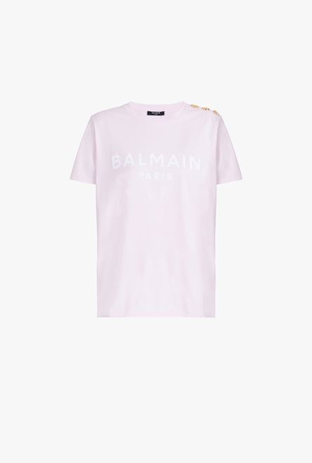 Pale pink and white organically cultivated cotton T-shirt Short sleeves, crew neck, embossed gold-tone buttons on shoulder, white Balmain logo print ITEM INFORMATION - Casual cut - Fits true to size, select your usual size - The model is wearing FR size 36 - The model's height is 179 cm / 5 ft 10.5 in, bust 84 cm / 33 in, waist 60 cm / 23 in, hips 94 cm / 37 in - Made in Portugal - Material: 100% Organically cultivated cotton - Item: WF1EF005B091OCD