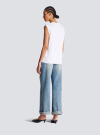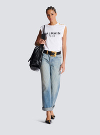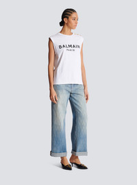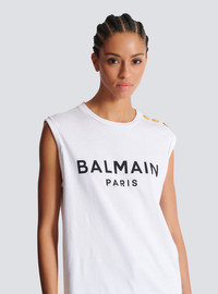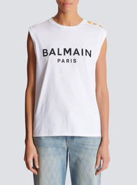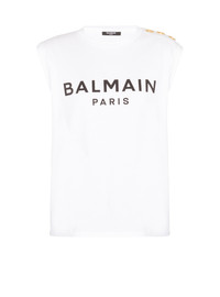 Balmain Paris tank top - Relaxed fit - Round neck with ribbed trim - 3 decorative embossed gold metal buttons on the shoulder - Armholes with double turn-up - Contrasting Balmain Paris logo printed on the front - Model measures 179cm and wears a size S - Main material: 100% cotton - Made in Portugal - Item: CF1ED001BB02100% of the cotton fibres used to make this garment are certified and organically farmed