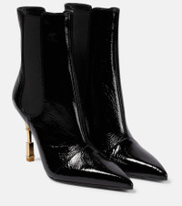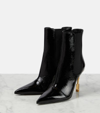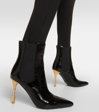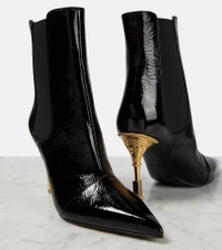 These Balmain ankle boots are elevated with a distinct gold-tone heel with logo engravings and sculptural details. Made from black patent leather, the style has a pointed toe and elasticated side inserts for comfort. Product Details - Upper: fabric, leather - Sole: leather insole and sole - Toe shape: pointed toe - Made in Italy - Designer color name: 0pa Noir - Closure: elasticated sides - Item number: P00814078 Size & Fit - True to size - European sizes - 9,5cm-3.5" heel (size EU 38)