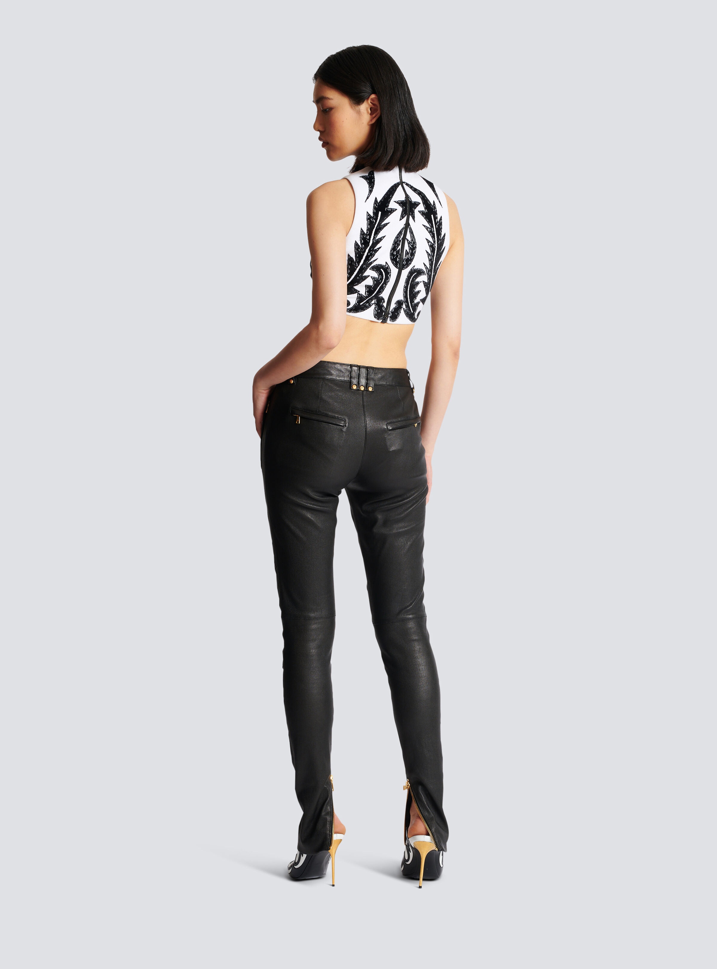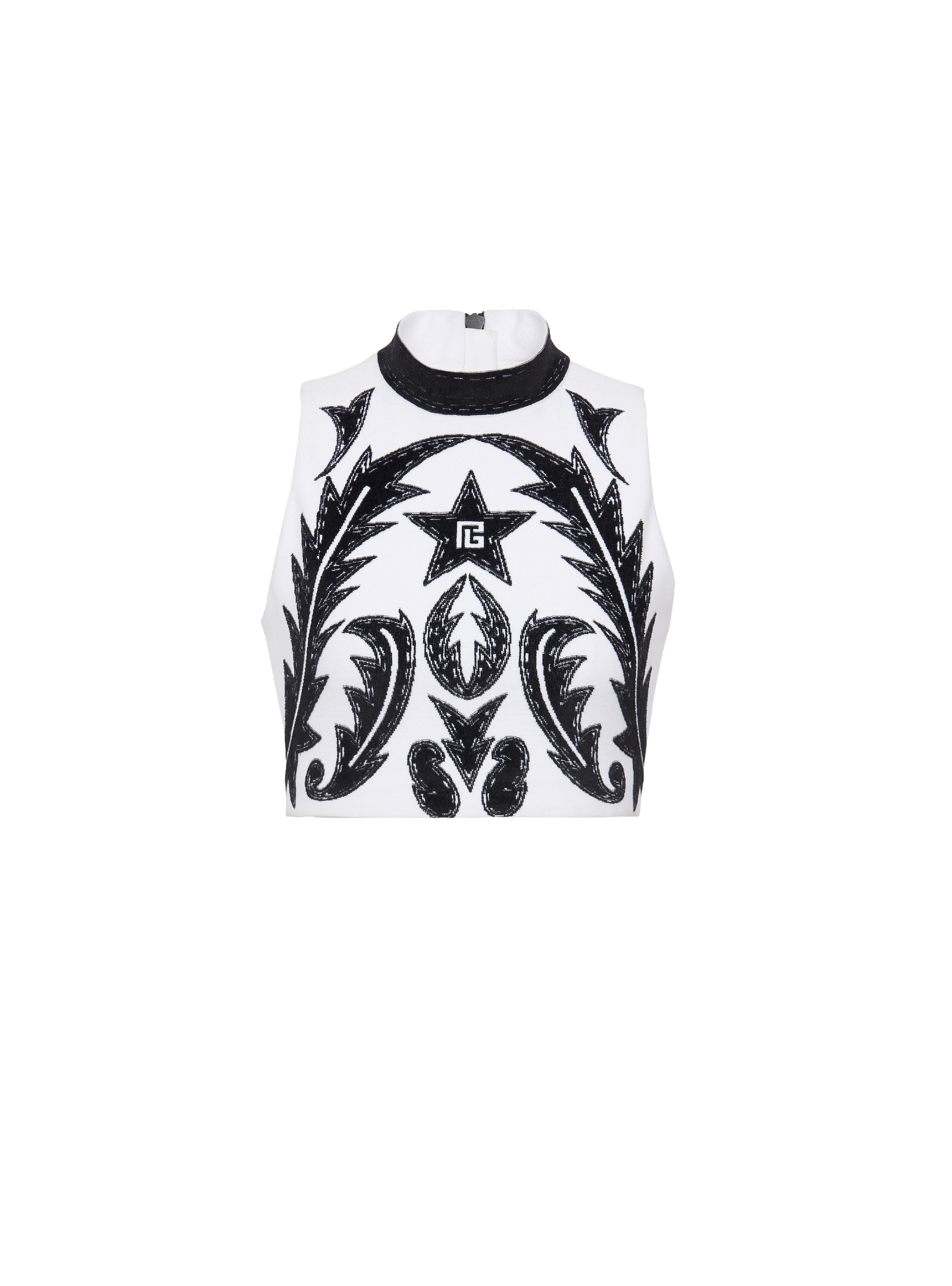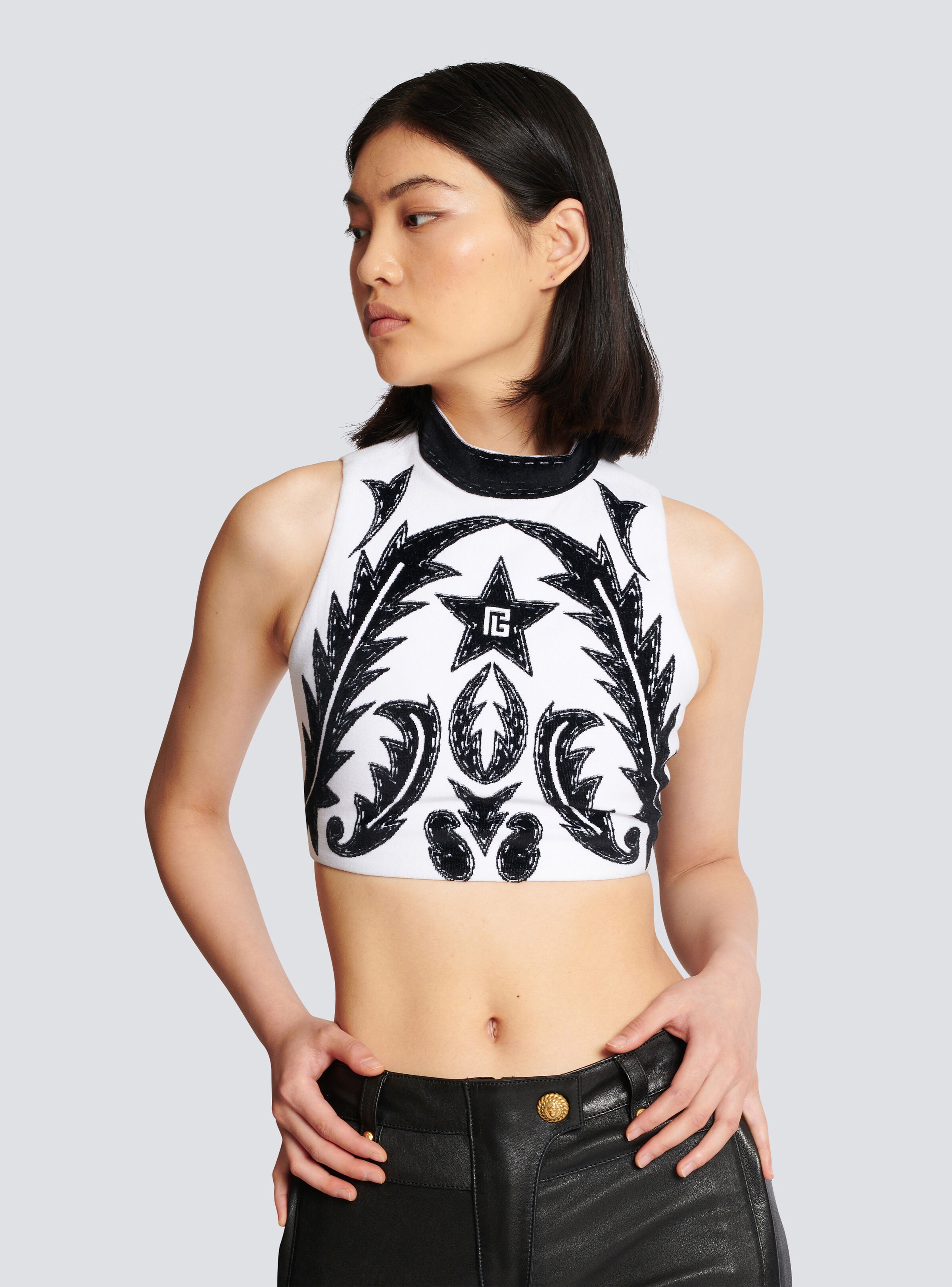 PB Baroque velvet jersey tank top - Contrasting PB logo - Contrasting velvet Baroque pattern - Short cut - Funnel neck - Cutaway shoulders - Fastening with black metal zip at the back - Model measures 178cm and wears a size 36 - Main material: 100% cotton - Made in Bulgaria - Item: CF1AB014JH72