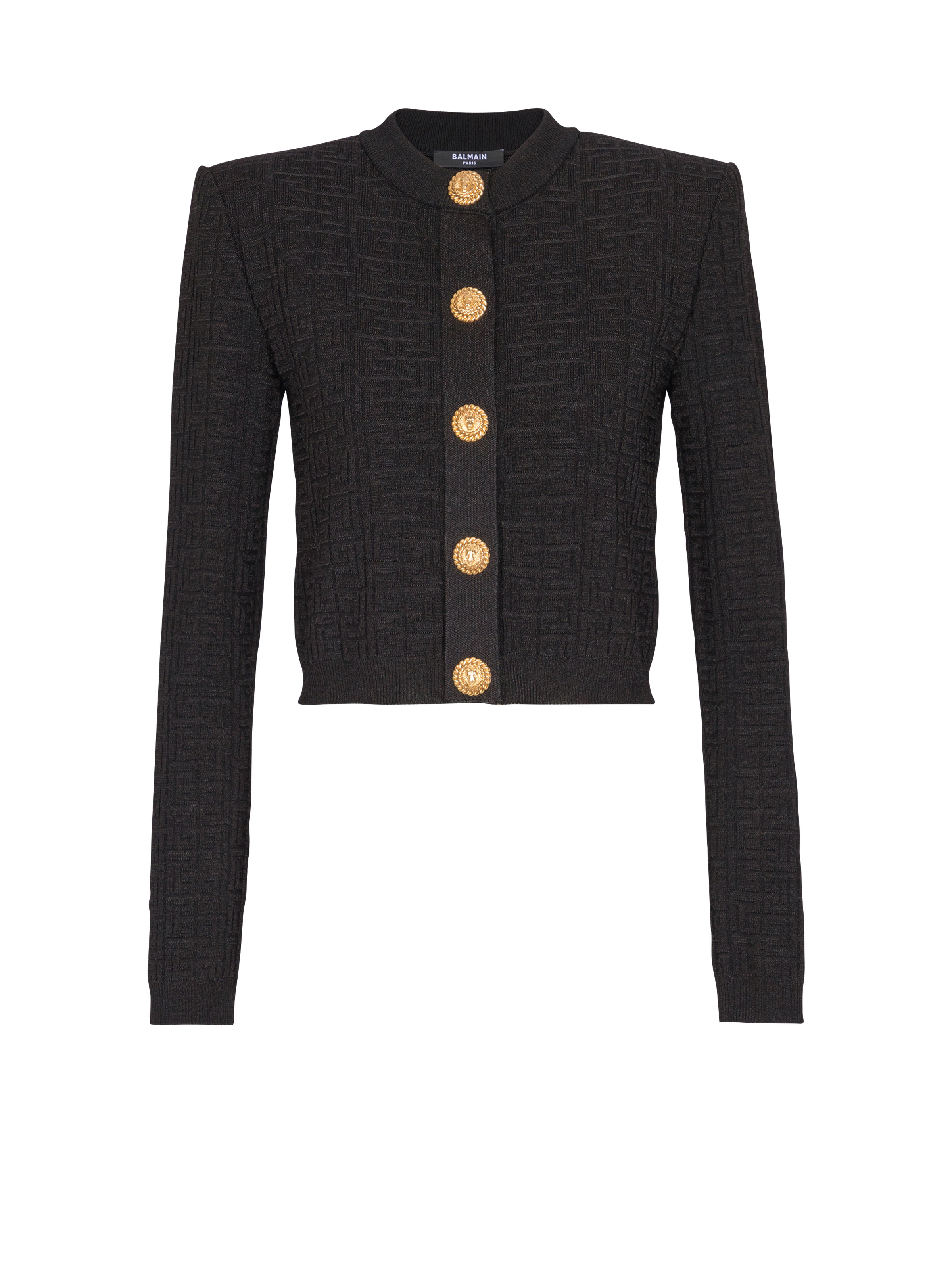 PB Labyrinth sparkly knit cardigan - Round neckline - Structured shoulders - Long sleeves - Fastening with 5 "Double Chain Lion" press studs in gold metal - Ribbed trim - Cropped slim fit - Model measures 179cm and wears a size 36 - Main material: 78% viscose 17% metallic polyester 5% polyester - Made in France - Item: EF1KL196KI24
