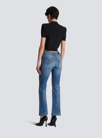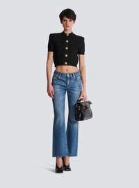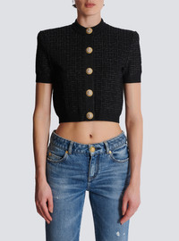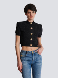 PB Labyrinth knit cardigan - Cropped and fitted cut - Structured shoulders - Crew neckline - Short sleeves - Fastening with 5 "Lion Head" press studs in gold and silver metal - Ribbed edging - Knit with shiny threads - Model measures 180cm and wears a size 36 - Main material: 86% viscose 10% polyester 4% metallic fibre - Made in France - Item: DF1SB215KG96100% of the viscose fibres used to make this garment come from certified, sustainably managed forests