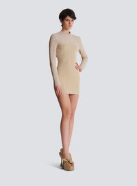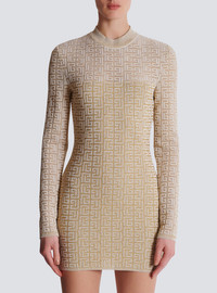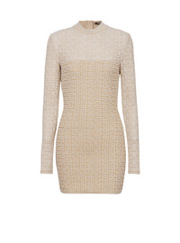PB Labyrinth knit dress - Short fitted cut - Round neckline - Long sleeves - Visible gold metal zip fastening on the back with Balmain Paris-engraved slider - Semi-transparent top and sleeves - Knit with shiny threads - Ribbed trim - Model measures 178cm and wears a size 36 - Main material: 76% viscose 16% metallic polyester 5% polyester 3% nylon - Made in France - Item: DF2R8029KH69