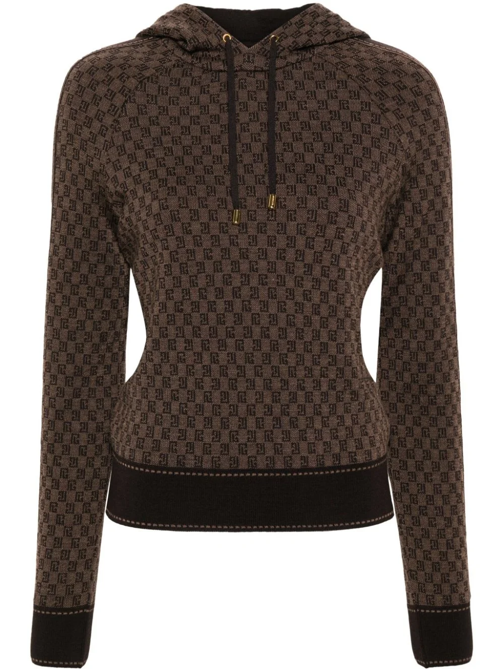PB Monogram-jacquard wool hoodie Balmain takes the archival route with this coffee-brown hoodie. Crafted from merino wool, it boasts a relaxed raglan-sleeve silhouette elevated by PB Monogram jacquard, a half-century-old iconic house code combining founder Pierre Balmain's initials with his fascination with French Renaissance gardens. It is framed by contrasting stitched trim. Highlights - Coffee brown - Merino wool - Signature pb monogram motif - Contrasting trim - Drawstring hood - Long raglan sleeves - Straight hem Made in France Composition Wool 100% SIZE & FIT Model measurements Height 5 ft 11 in(1.8 m) Bust/Chest 30.7 in(78 cm) Hips 35.03 in(89 cm) Waist 24.4 in(62 cm) FittingInformation Designed for a slim fit that sits just away from the body offering a close yet comfortable fit The ribbed hem offers a close, comfortable fit Made with a midweight knit, this piece offers some stretch This piece fits true to size – take your usual size Washing instructions Hand Wash
