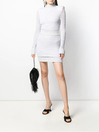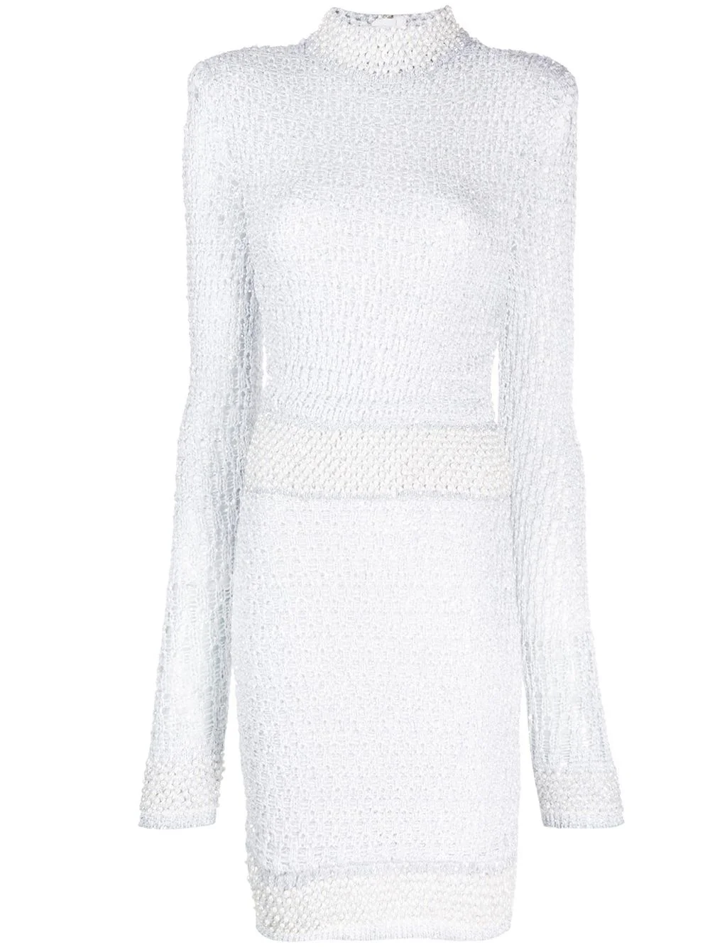 pearl and sequin embellished knitted dress Balmain continues the evolution of the house’s classic styles. Equal amounts decorative, daring and refined, these garments are an elevation of Parisian craftsmanship such as this off-white pearl and sequin embellished knitted dress. Featuring a roll neck, long sleeves, a fitted silhouette, a back zip fastening, an uneven open knit design, a ribbed hem and cuffs, sequin embroidery and faux-pearl embellishments. Made in Italy Composition Urea-formaldehyde 100%, Viscose 50%, Polyester 42%, Polyamide 6%, Polyethylene 2% SIZE & FIT Model measurements Height 5 ft 10 in(1.78 m) Bust/Chest 31.49 in(80 cm) Hips 36.22 in(92 cm) Waist 25.59 in(65 cm) FittingInformation This piece fits true to size. We recommend you get your regular size Cut for a slim fit Made with a mid-weight stretch fabric Washing instructions Dry Clean Only