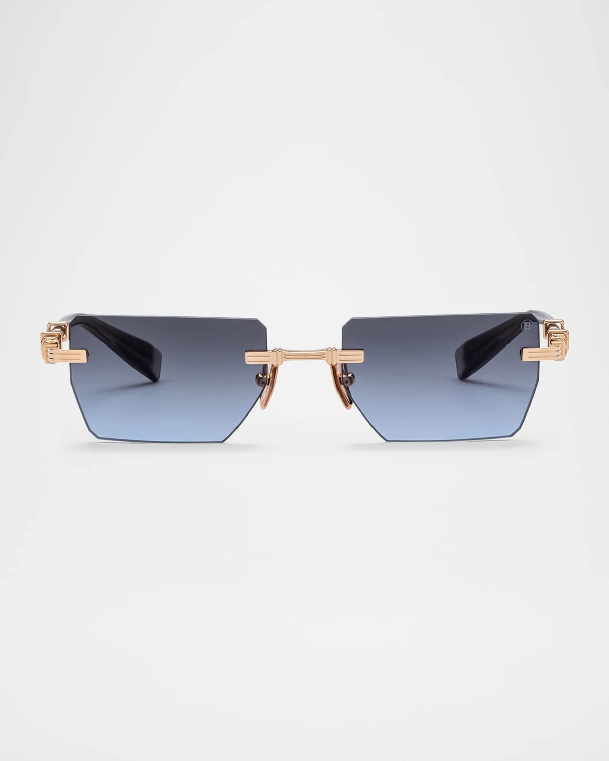 - Balmain "Pierre" rectangle sunglasses in titanium - Gradient lenses - Adjustable nose pads - Thin, tapered arms - Capped earpieces - Classic logo at lens - Titanium - 100% UVA/UVB protection - Made in Japan - Proposition 65 warning for California residents