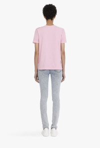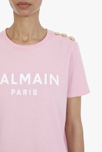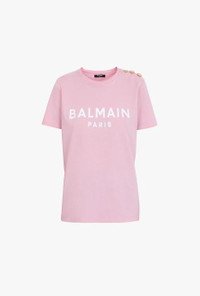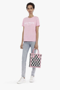 Pink and white cotton T-shirt Short sleeves, crew neck, white flocked Balmain logo ITEM INFORMATION - Relaxed fit - Fits true to size, select your usual size - The model is wearing size FR 36 - The model's height is 173 cm / 5'8 in, bust 85 cm / 33.5 in, waist 61 cm / 24 in, hips 92 cm / 36 in - Made in Portugal - Material: 100% Cotton - Item: VF11350B012OBR