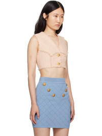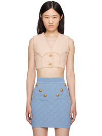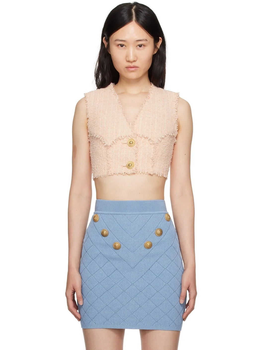 Nylon- and virgin wool-blend tweed tank top. Frayed edges throughout. · Paneled construction · V-neck · Button closure · Cropped hem · Full viscose-blend twill lining · Logo-engraved gold-tone hardware Supplier color: Rose Body: 79% polyamide, 15% virgin wool, 6% cotton. Lining: 52% viscose, 48% cotton. Made in Poland 241251F068000