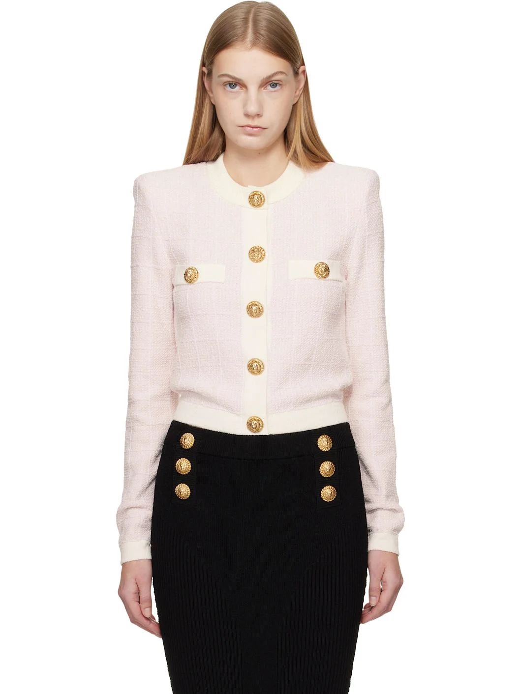 Cotton-blend tweed cardigan. · Metallic thread detailing throughout · Rib-knit crewneck · Press-stud closure · Button hardware at chest · Padded shoulders Supplier color: Rose pale/Nature Body: 46% cotton, 26% viscose, 21% polyamide, 5% polyester, 1% metallised polyester. Trim 1: 38% cotton, 29% viscose, 27% polyamide, 6% polyester. Trim 2: 42% viscose, 32% cotton, 17% polyamide, 9% polyester. Made in France 261251F095005