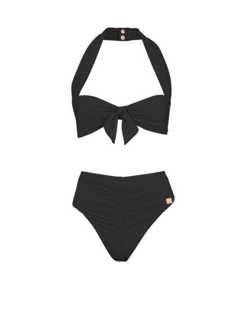 Plain two-piece swimsuit - Bow on the front - Gathered straps - Halterneck fastening with 2 “Chain Lion” press studs - Side gathers - Panels on the sides - Balmain Paris-engraved hook fastening at the back - Gathered high-waisted bottoms - Metal PB plaque on the side - Gold hardware - Lined - Model measures 179cm and wears a size 36 - Main material: 85% polyamide 15% elastane - Made in Italy - Item: BKBBT2440