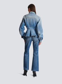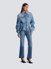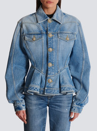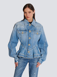 Pleated denim jacket - Light blue wash - Defined waist and pleated hem - Italian collar - Long sleeves - Cuffs with slits and buttons - 2 chest pockets with buttoned flaps - Fastening with 5 buttons - Two-tone "Double Chain Lion" buttons in gold and silver metal - Model measures 179cm and wears a size 36 - Main material: 100% cotton - Made in Italy - Item: DF1SI560DE53