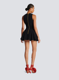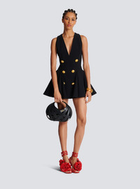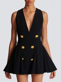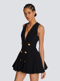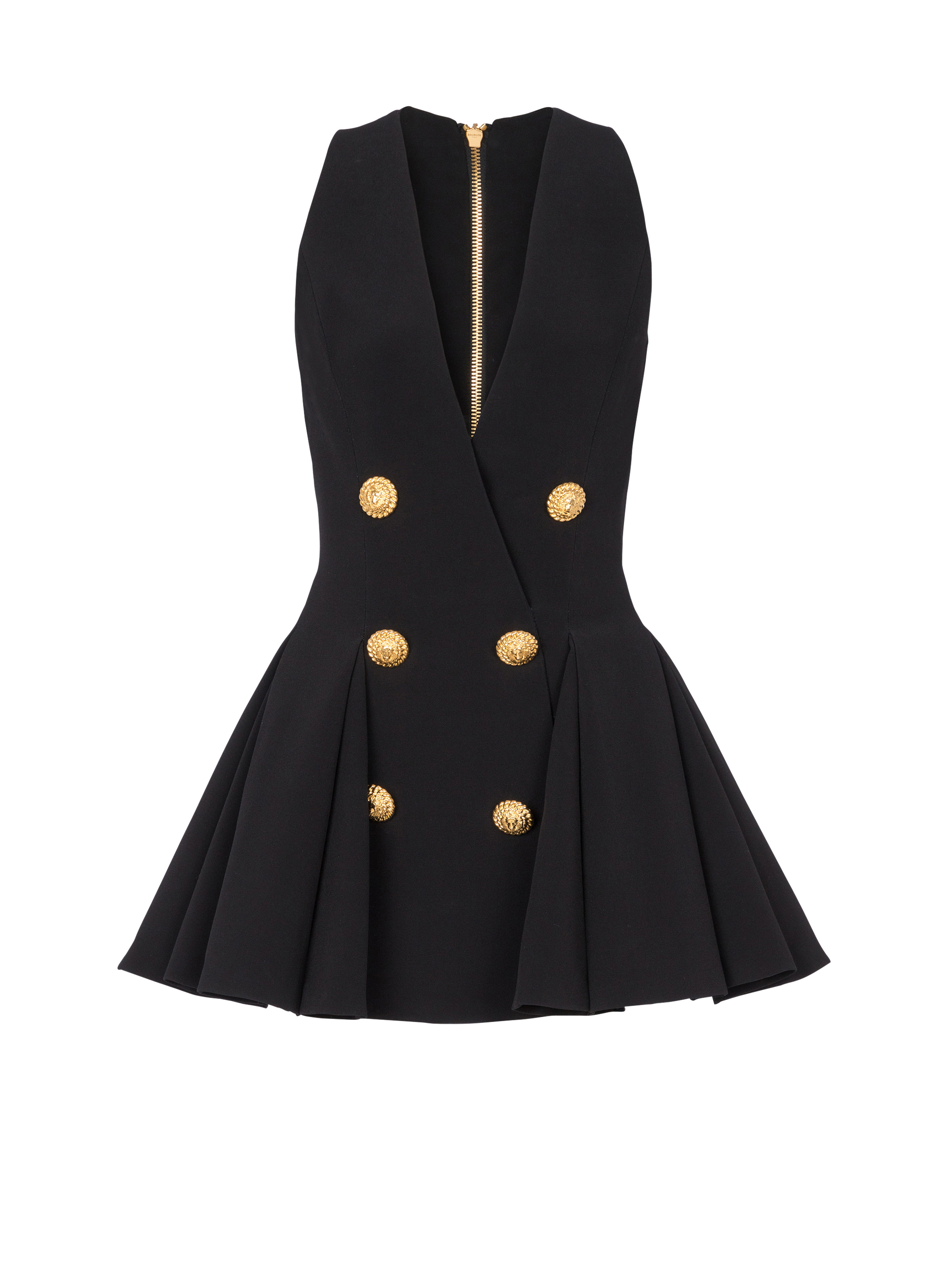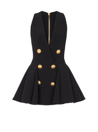 Pleated crepe dress - Short flared cut - Marked waist - V-neck - Sleeveless - Double-breasted front with 6 decorative "Double Chain Lion" buttons in gold metal - Visible gold metal zip fastening on the back with Balmain Paris-engraved slider - Twill lining - Model measures 179cm and wears a size 36 - Main material: 100% viscose - Made in Romania - Item: CF0R5024VB00100% of the viscose fibers in this garment come from sustainably managed forests and certified