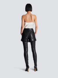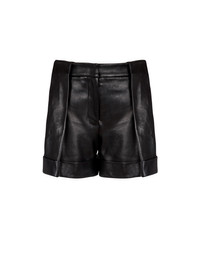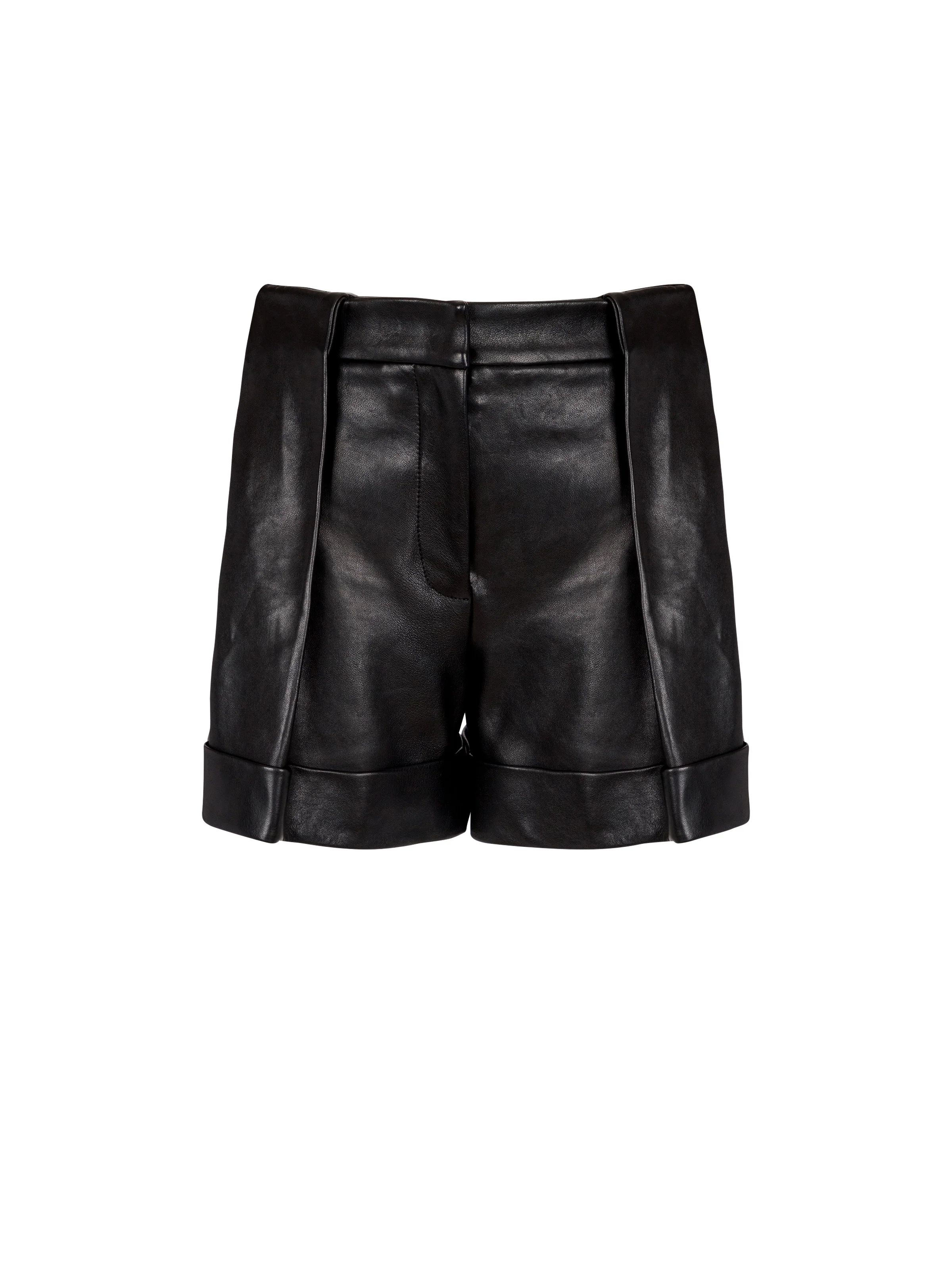 Pleated plain lambskin shorts - Waistband with belt loops and a triple belt loop at the back - Front pleats with belt loops - Zip and hook fastening under a placket - 2 slash side pockets - 2 slash pockets on the back - Cuffed hem - Twill lining - Flared high-waisted fit - Model measures 178cm and wears a size 36 - Main material: 100% lambskin - Made in Bulgaria - Item: EF0QA090LC62