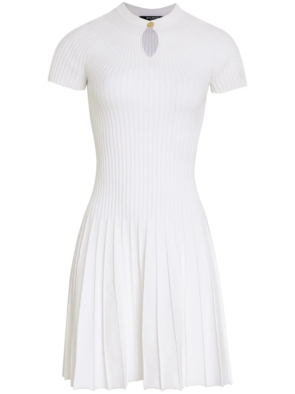 pleated ribbed-knit mini dress Highlights - White - Ribbed knit - Pleat detailing - Front button fastening - Keyhole neck - Short sleeves - Fitted waistline - Pleated skirt - Straight hem - Thigh-length Made in France Composition Viscose 67%, Polyester 33%