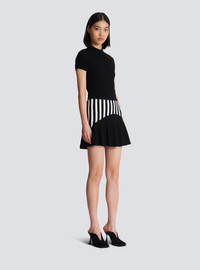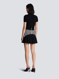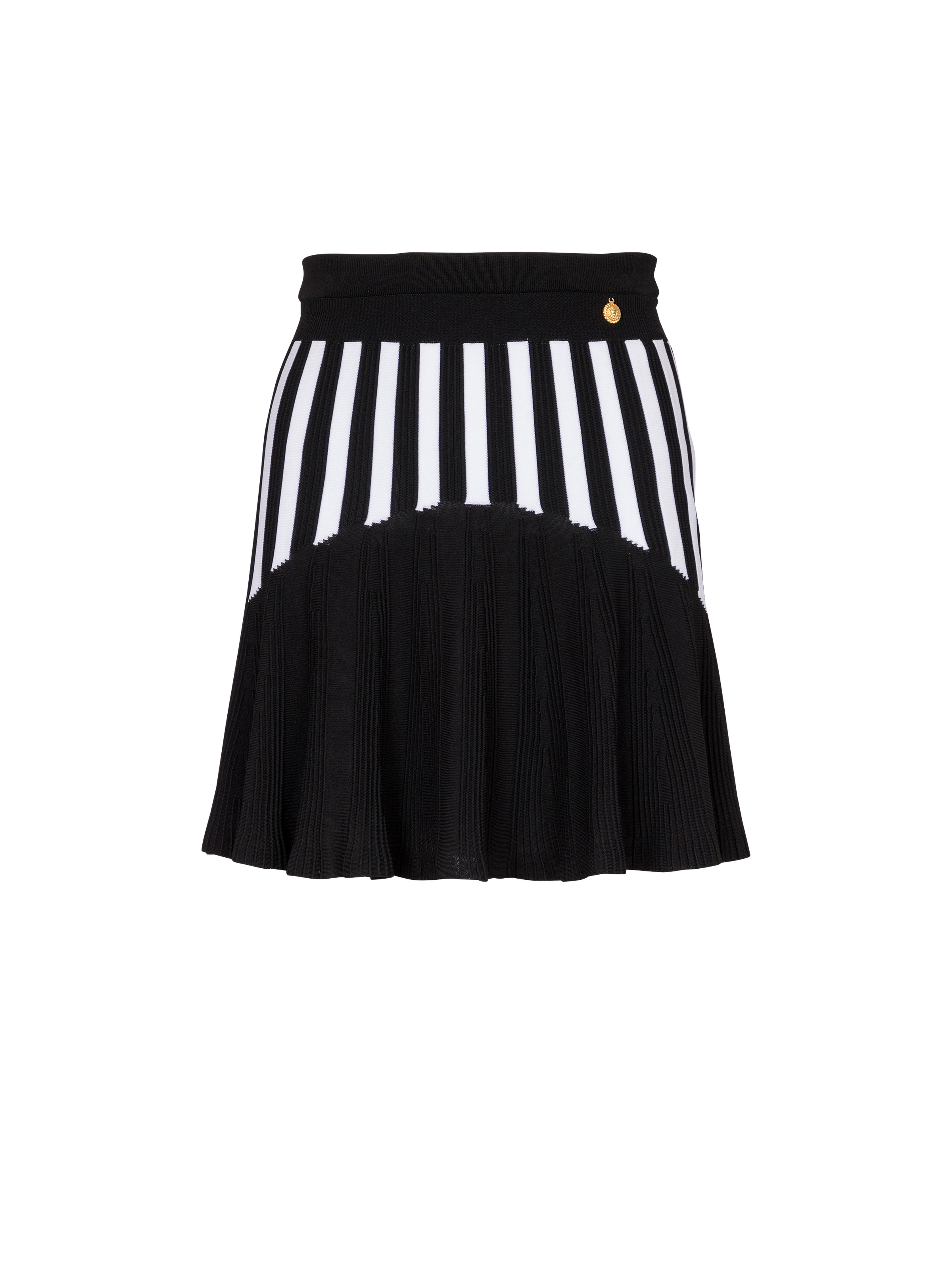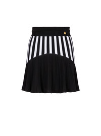 Pleated striped knit skirt - Short, flared, high-waisted fit - Visible gold metal zip fastening on the back with Balmain Paris-engraved slider - "Double Chain Lion" medallion in gold metal - Two-tone ribbed knit - Model measures 178cm and wears a size 36 - Main material: 89% viscose 8% polyester 3% polyamide - Made in Italy - Item: DF1LB663KG58100% of the viscose fibres used to make this garment come from certified, sustainably managed forests
